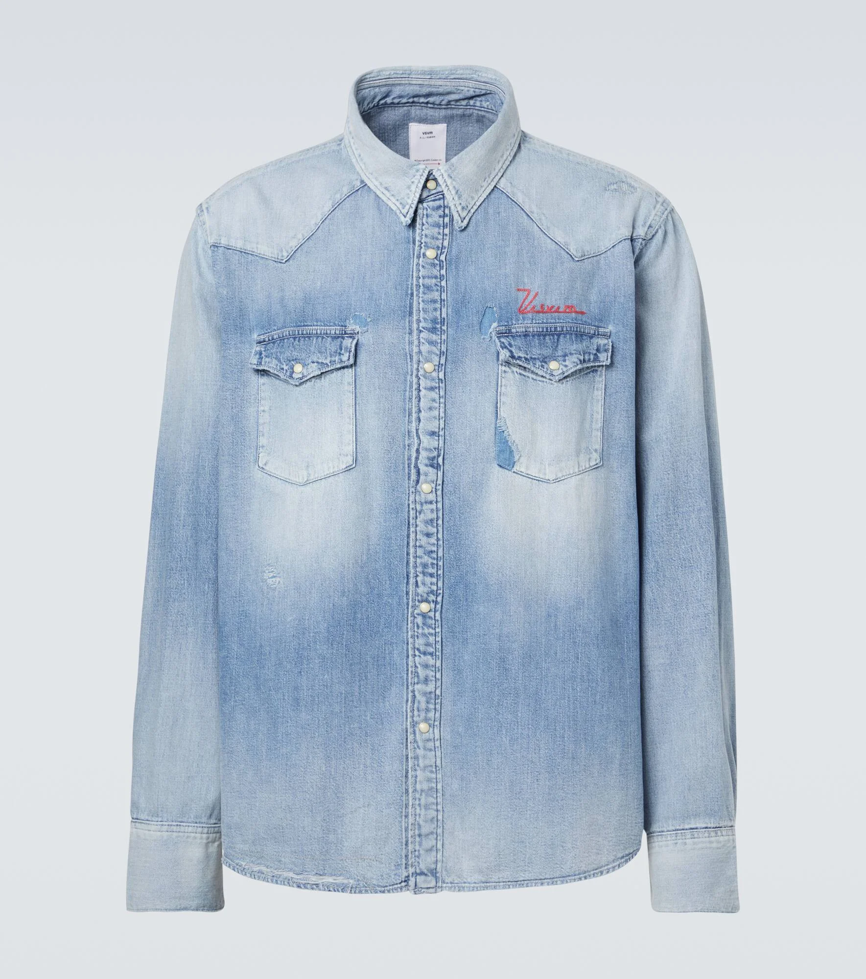 Based in Tokyo, Visvim masterfully blends traditional Japanese craft techniques with vintage-inspired apparel. Made from pure cotton denim, this classic shirt comes with light distressing throughout and logo detailing at the chest. Product Details - Material: 100% cotton - Care instructions: hand wash - Made in Japan - Designer color name: Indigo - Item color: blue - Collar: classic (Straight point) - Cuff: three buttons - Pockets: patch pockets - Closure: snap-buttoned front - Distressed details - Item number: P01127577 Size & Fit - True to size - Without pleats in the back - Classic fit - Non-stretchy fabric - Falls below the hip - The model in the picture is 185cm-6'1" and wearing a size 4