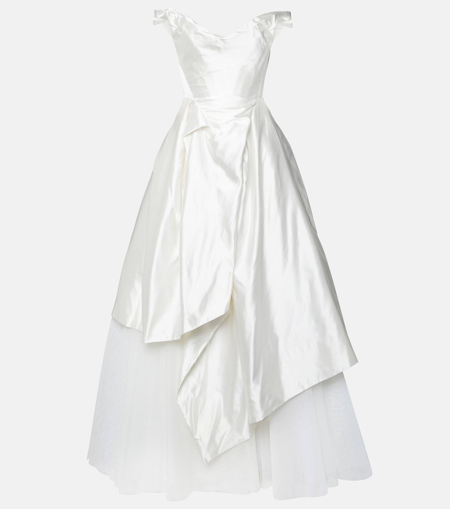 The dreamy Nebula bridal gown embodies the essence of Vivienne Westwood’s avant-garde reign. Made from silk, this masterpiece brings an element of drama with its voluminous full skirt and flattering figure-hugging off-shoulder bodice. Product Details - Material: 100% silk - Care instructions: dry clean - Made in the UK - Designer color name: Pearl White - Item number: P00802191 Size & Fit - True to size - Off-the-shoulder - Cinched waist - Heavy material - The model seen in the picture is 178cm-5'10" and wearing a size UK 8