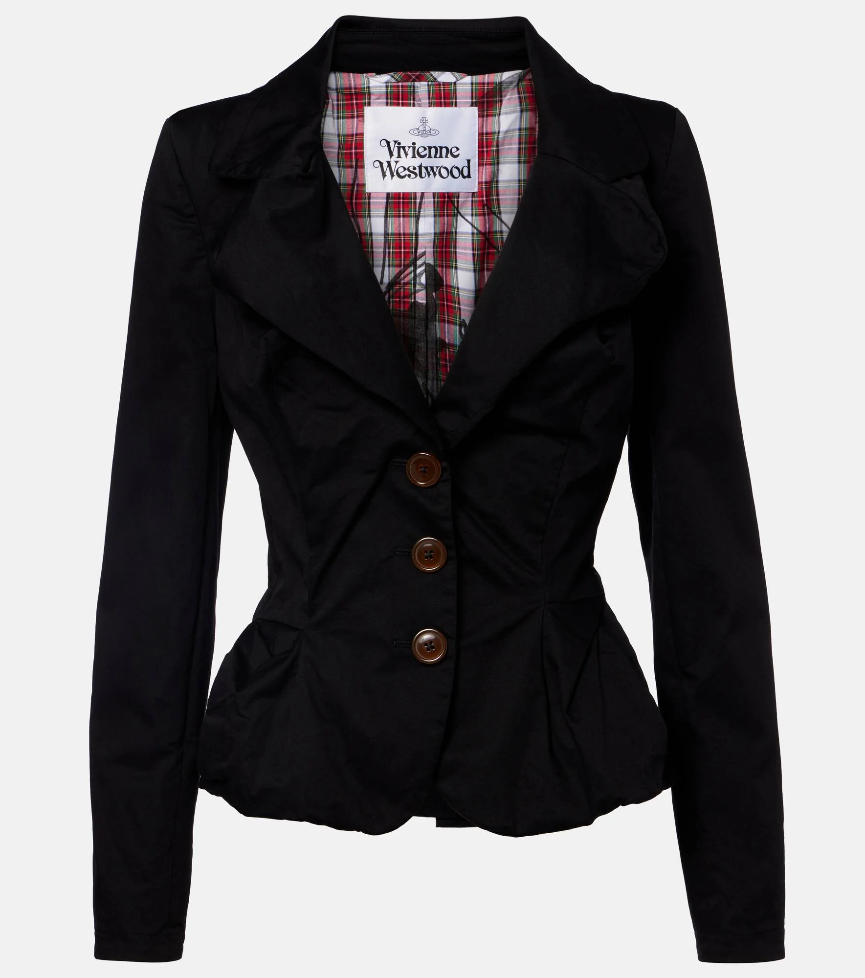 Vivienne Westwood’s designs continue to exemplify the disruptive energy of its late founder – fashion’s original punk pioneer. Made in Italy from cotton-blend fabric, this sculpted blazer is a single-breasted piece with shoulder pads, side slit pockets, and a notched lapel. Product Details - Material: 97% cotton, 3% elastane - Care instructions: dry clean - Made in Italy - Color: black - Designer color name: Black - Lining: 100% cotton - Sleeve lining: 100% cotton - Pocket lining: 100% cotton - Notched lapel - Shoulder pads - Closure: buttoned front - Cuff: one button - Pockets: side slit pockets - Vent: single - Item number: P01121185 Size & Fit - True to size - Cinched waist - Non-stretchy fabric - Falls to the hip - The model seen in the picture is 178cm-5'10" and wearing a size IT 40