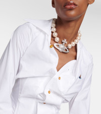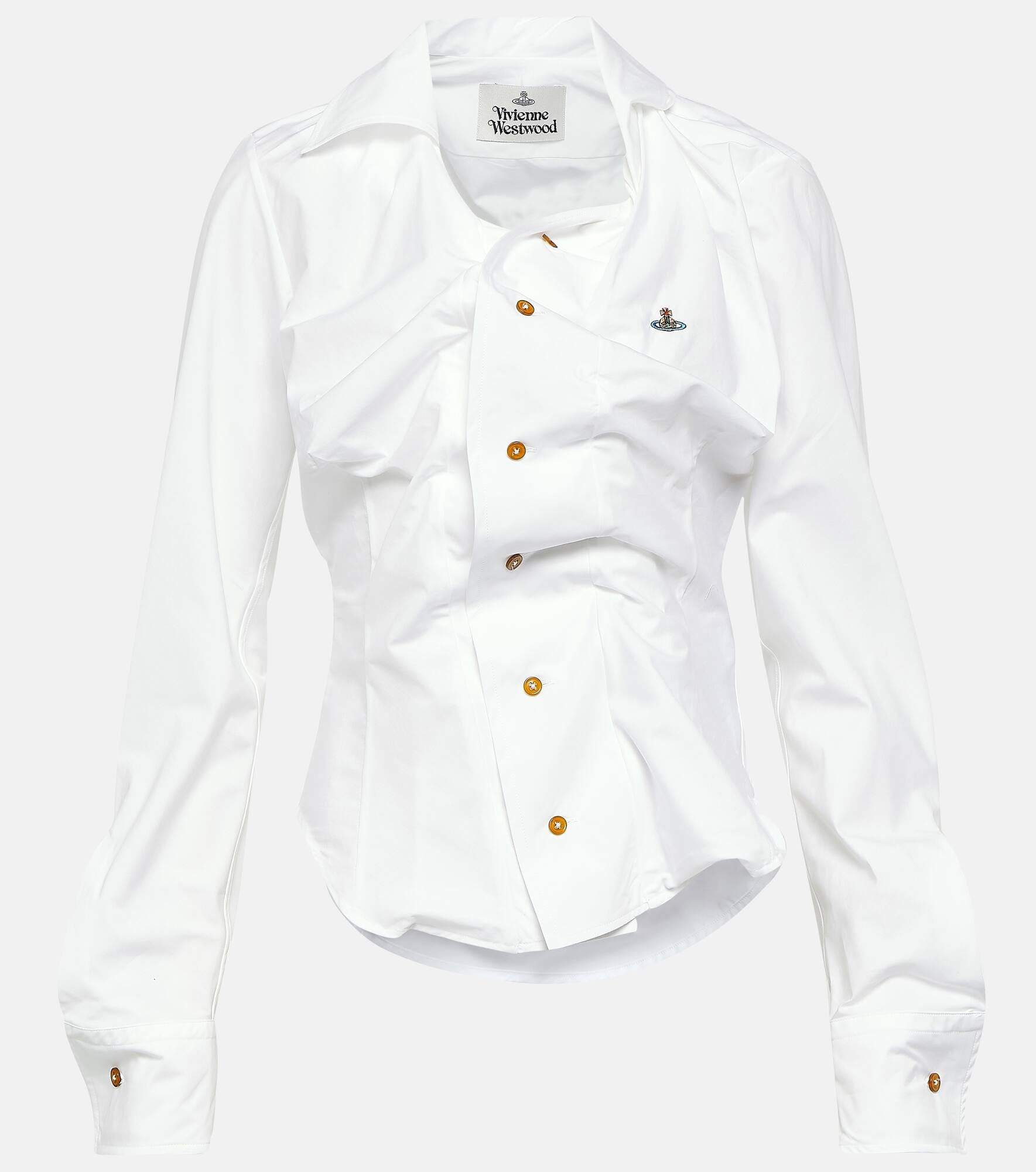 Gathering at the front and a twisted collar make the Drunken shirt from Vivienne Westwood truly unique. Made from cotton poplin, this white slim-fit style is finished with logo embroidery on the chest. Product Details - Care instructions: machine wash at 40 degrees - Made in Romania - Material: 100% cotton - Designer color name: White - Embroidery: 30% polyester, 70% viscose - Closure: buttoned placket - Buttoned cuffs - Item number: P00836307 Size & Fit - True to size - Cinched waist - Lightweight material - Falls to the hip - The model seen in the picture is 178cm-5'10" and wearing a size IT 40