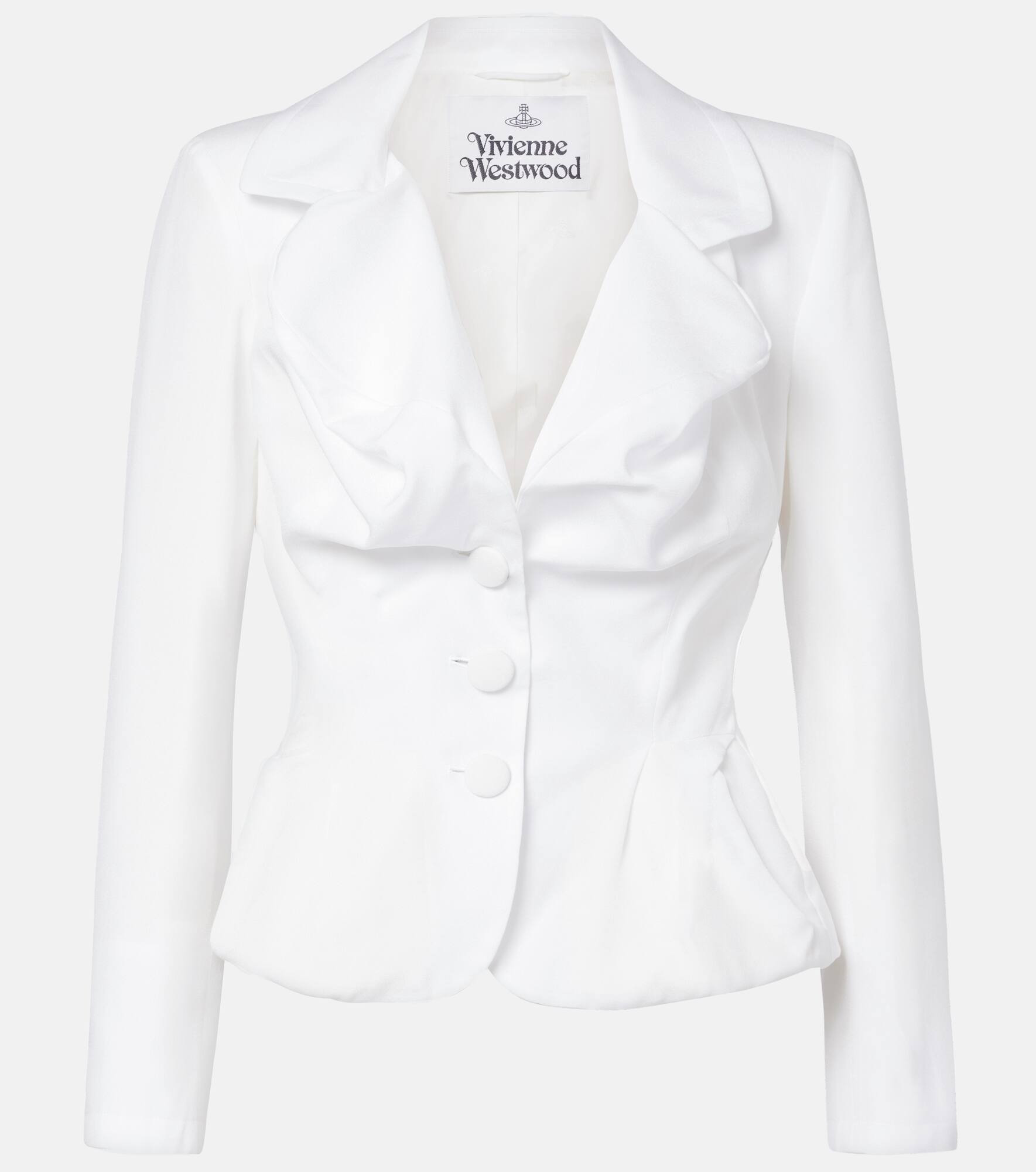 Vivienne Westwood's Drunken jacket is cut following the brand's signature tailoring pattern cutting system, resulting in a unique design that flatters the figure and challenges traditional silhouettes. The style is finished with tonal buttons and notched lapels. Product Details - Material: 100% viscose - Care instructions: dry clean - Made in Italy - Designer color name: Off White - Item color: white - Lining: 100% viscose - Closure: single-breasted (three buttons) - Cloverleaf lapel - Shoulder pads - Cuff: one button - Pockets: side slit pockets - Vent: single - Fully lined - Item number: P01074693 Size & Fit - True to size - Shoulder pad inserts - Cinched waist - Non-stretchy fabric - Falls to the hip - The model seen in the picture is 178cm-5'10" and wearing a size IT 40