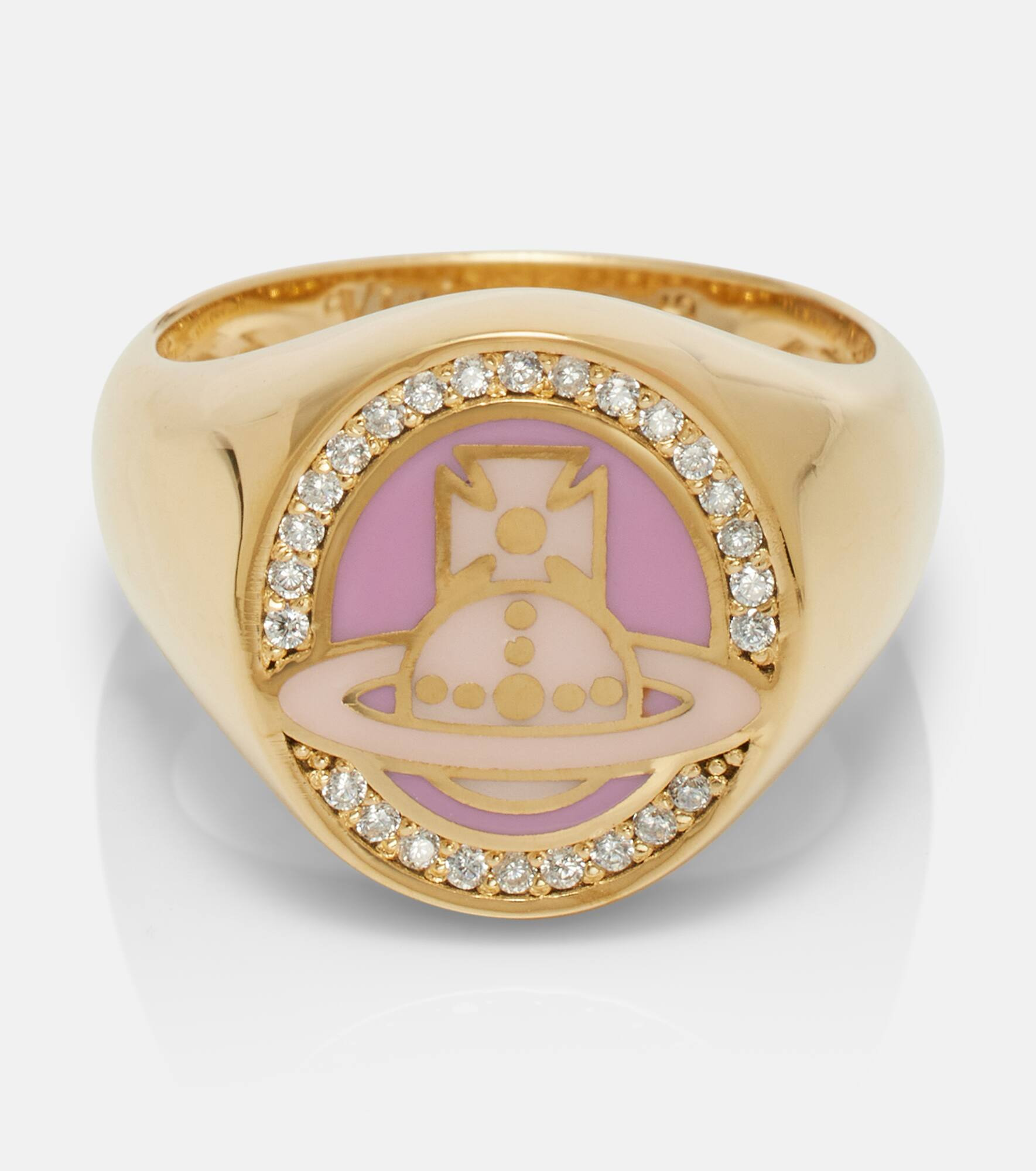 This Vivienne Westwood ring reflects the brand’s signature refinement, featuring sparkling detailing at its center. The piece is adorned with the iconic Sovereign’s Orb, representing a bridge between tradition and the future. Product Details - Material: 925 sterling silver - Made in Thailand - Item color: gold, purple - Item number: P00999796 Size & Fit - Max. width 1,4cm-0.5" - Circumference size S= 52mm-2.05" - Circumference size M= 56mm-2.2" - Circumference size L= 59mm-2.3"
