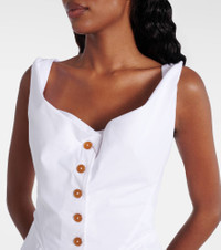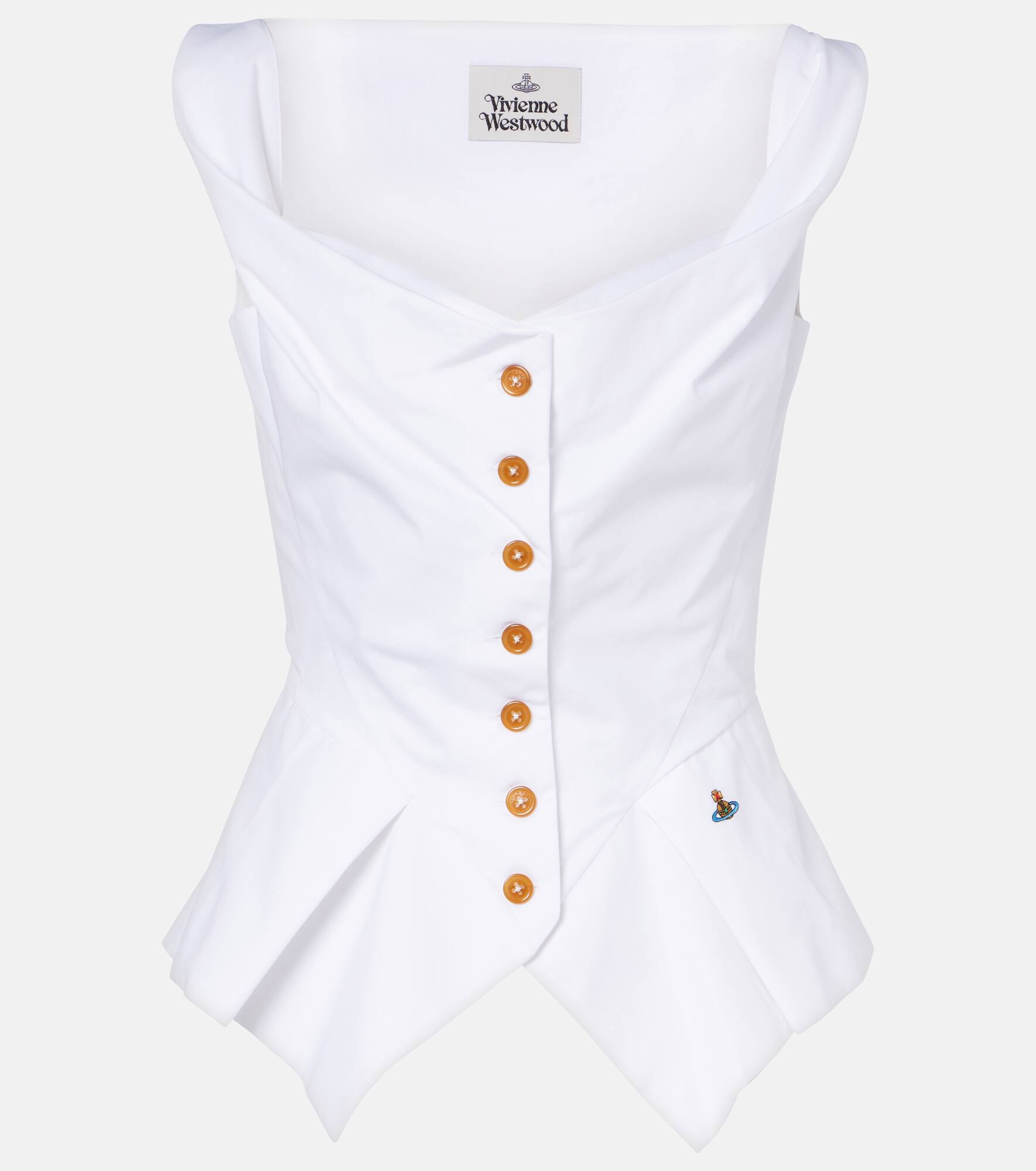 The Monday vest from Vivienne Westwood is defined by a striking silhouette, featuring a fitted bodice that flares at the waist. Made from crisp cotton, the design has sculptural folds around the neckline. Product Details - Material: 100% cotton - Care instructions: machine wash at 30 degrees - Made in Italy - Designer color name: Aw25-White - Item color: white - Closure: buttoned front - Item number: P01065072 Size & Fit - True to size - Fitted - Non-stretchy fabric - Slightly cropped - The model seen in the picture is 178cm-5'10" and wearing a size IT 40