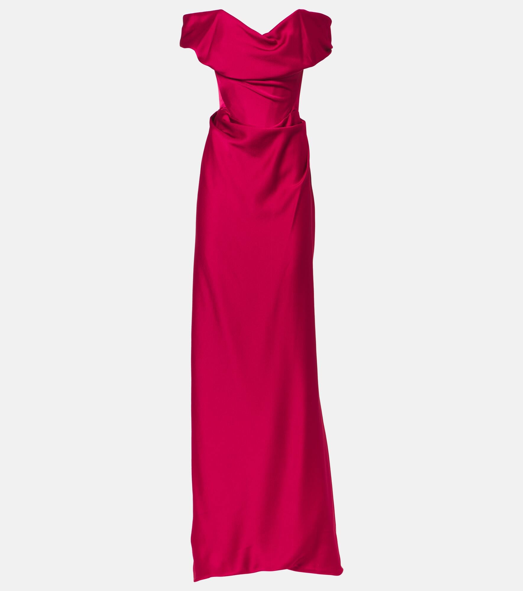 Product Details - Material: 73% acetate, 27% viscose - Care instructions: dry clean - Made in the UK - Designer color name: Burgundy - Lining: 100% silk - Closure: zipper, hook fastening - Item number: P00954942 Size & Fit - True to size - Off-the-shoulder - Internal boned corset for support - Cinched waist - Non-stretchy fabric - slit length 69,0cm-27" - The model seen in the picture is 178cm-5'10" and wearing a size UK 8
