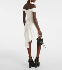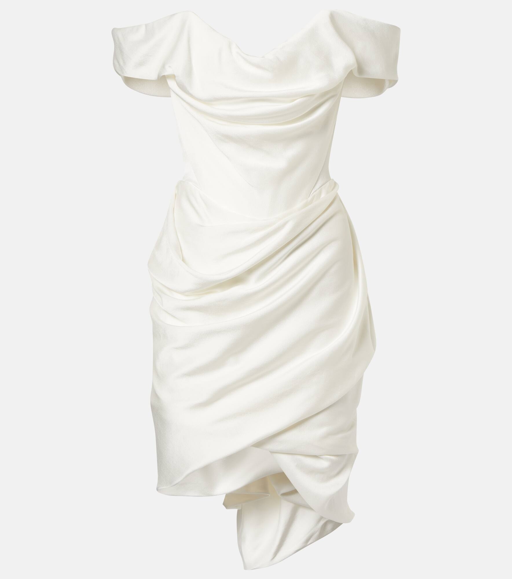 Product Details - Material: 73% viscose, 27% acetate - Care instructions: dry clean - Made in the UK - Designer color name: Pearl White - Closure: zipped back - Item number: P00945423 Size & Fit - Fits small to size - we recommend trying one size larger - Off-the-shoulder - Internal boned corset for support - Cinched waist - Non-stretchy fabric - The model seen in the picture is 178cm-5'10" and wearing a size UK 10