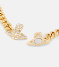 Vivienne Westwood's Orb motif represents the rebellious undercurrent of the iconic label. The motif appears as an embellished magnetic pendant, securing the exaggerated curb chain-link length of this necklace. Product Details - Closure: magnetic fastening - Material: brass - Made in Thailand - Item number: P00814444 Size & Fit - Length when open 41,5cm-16.5" - Max. width 2,3cm-1"