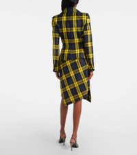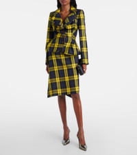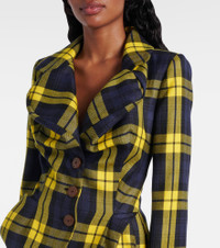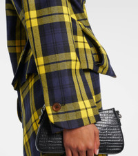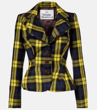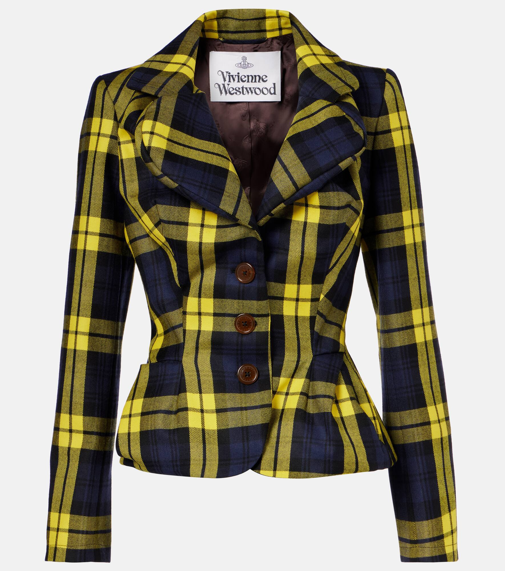 Crafted from virgin wool, this plaid jacket from Vivienne Westwood features a sculpted, cinched waist silhouette with a cloverleaf lapel. The sophisticated design is complete with shoulder pad inserts, single-breasted closure and slant pockets. Product Details - Material: 100% virgin wool - Care instructions: dry clean - Made in Italy - Designer color name: Aw25-Navy/Yellow - Item color: blue, yellow - Lining: 100% viscose - Sleeve lining: 100% viscose - Cloverleaf lapel - Closure: single-breasted (three buttons) - Cuff: one button - Vent: single - Pockets: slant pockets - Shoulder pads - Item number: P01065092 Size & Fit - True to size - Shoulder pad inserts - Cinched waist - Non-stretchy fabric - Falls to the hip - The model seen in the picture is 178cm-5'10" and wearing a size IT 40