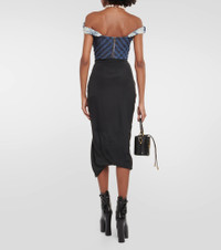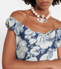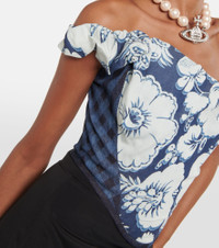A brand staple and symbol of empowerment, Vivienne Westwood's modern take on the corset exhibits a penchant for historicism and subversion. The blue floral denim Sunday top has a draped cowl off-shoulder neckline. Product Details - Material: 100% cotton - Care instructions: hand wash - Made in Italy - Designer color name: Blue/White - Lining: 100% cotton - Lining II: 100% polyester - Closure: zipped back - Item number: P00836319 Size & Fit - True to size - Off-the-shoulder - Internal boned corset for support - Fitted - Mid-weight material - Cropped - The model seen in the picture is 178cm-5'10" and wearing a size IT 40