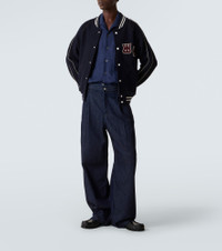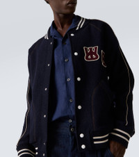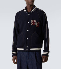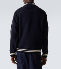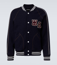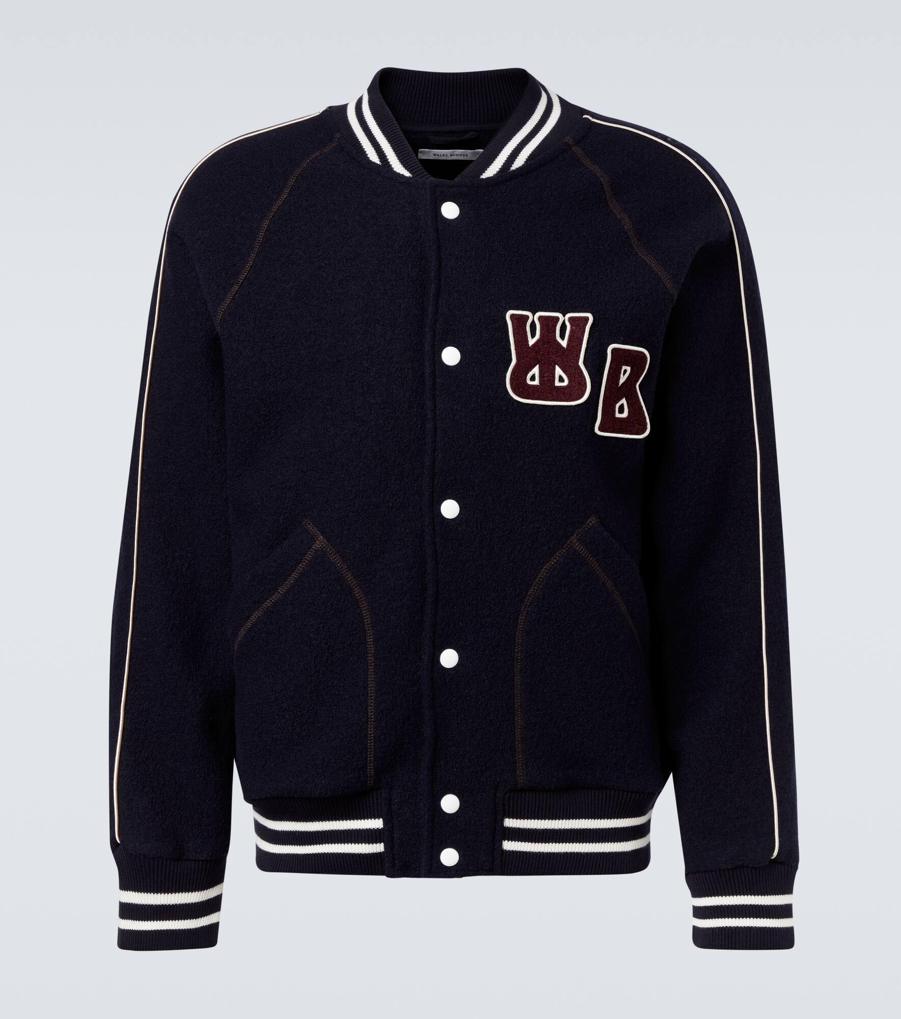 The October varsity jacket from Wales Bonner is made from boiled virgin wool and features striped trims. This college-inspired style features a snap-buttoned front and embroidered details on the chest. Product Details - Material: 100% virgin wool - Care instructions: dry clean - Made in Portugal - Designer color name: Navy - Item color: blue, white - Closure: snap-buttoned front - Cuff: ribbed - Hem: ribbed - Pockets: side slit pockets - Item number: P01068406 Size & Fit - True to size - Designed for a loose fit - Elasticated hem - Slightly stretchy fabric - Falls to the hip - Height of model is 192cm-75.5" and wears a size L