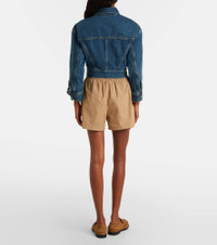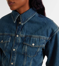 Wardrobe.NYC's elegant everyday essentials are produced in limited numbers with the needs of modern urban life in mind. A timeless design reimagined in a cropped fit, this denim jacket is accented with faux pearl buttons and contrasting topstitching. Product Details - Material: 100% cotton - Care instructions: machine wash at 30 degrees - Made in Turkey - Designer color name: Indigo - Item color: blue - Hardware color: silver - Collar: classic (Straight point) - Cuff: buttoned - Pockets: flap chest pockets - Closure: snap-buttoned front - Item number: P01066038 Size & Fit - True to size - Dropped shoulders - Cinched waist - Non-stretchy fabric - Cropped - The model seen in the picture is 178cm-5'10" and wearing a size XS