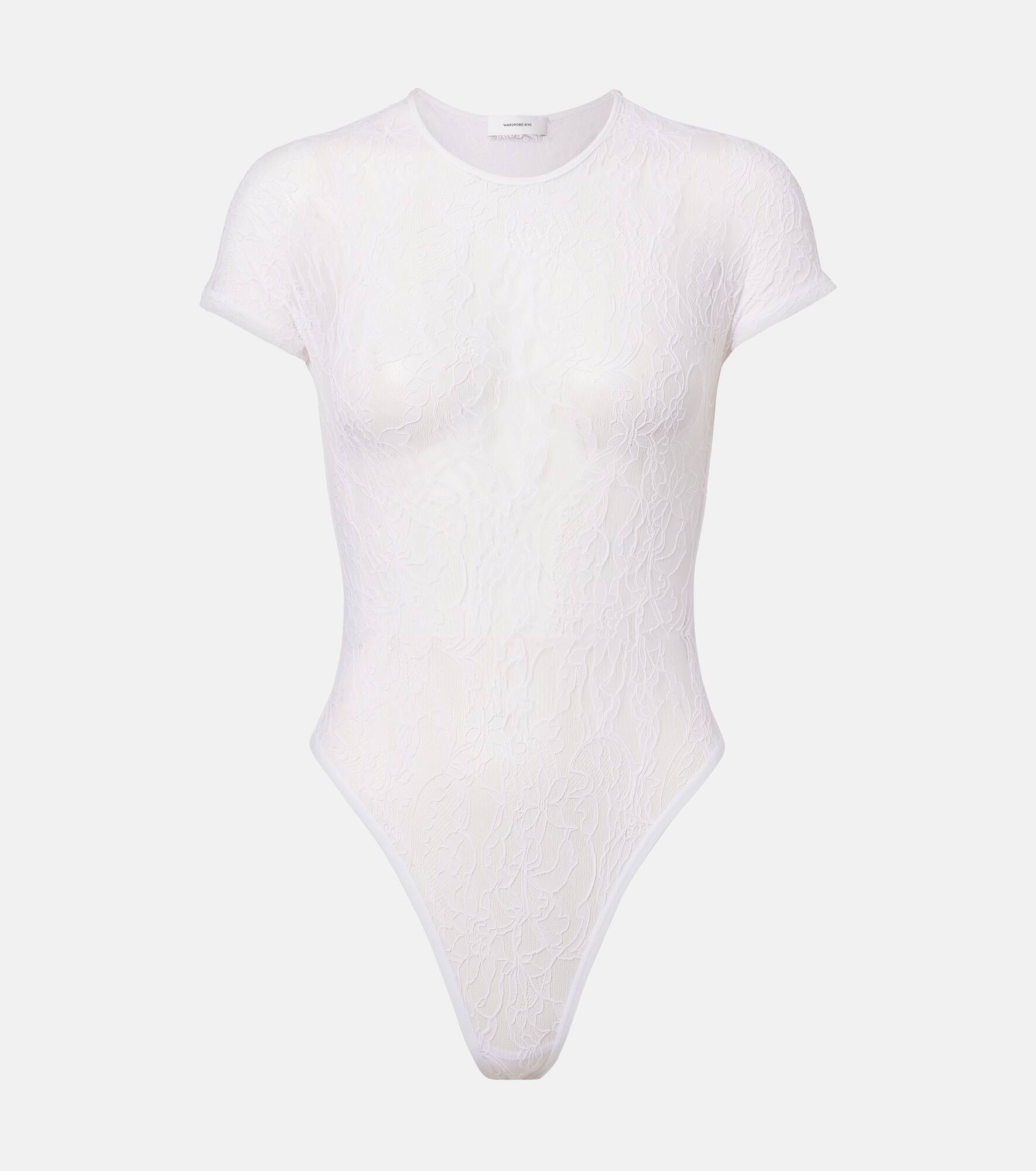 Wardrobe.NYC's elegant everyday essentials are produced in limited quantities with versatility, supreme quality, and modern urban life at their core. Made purely from white lace, this bodysuit features short sleeves and high-cut leg openings. Product Details - Material: 85% polyamide, 15% elastane - Care instructions: dry clean - Made in Portugal - Designer color name: White - Item color: white - Item number: P01059025 Size & Fit - True to size - Fits small to size - we recommend trying one size larger - Close fit at the neck - Fitted - Stretchy fabric - High-cut leg - The model seen in the picture is 178cm-5'10" and wearing a size S