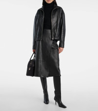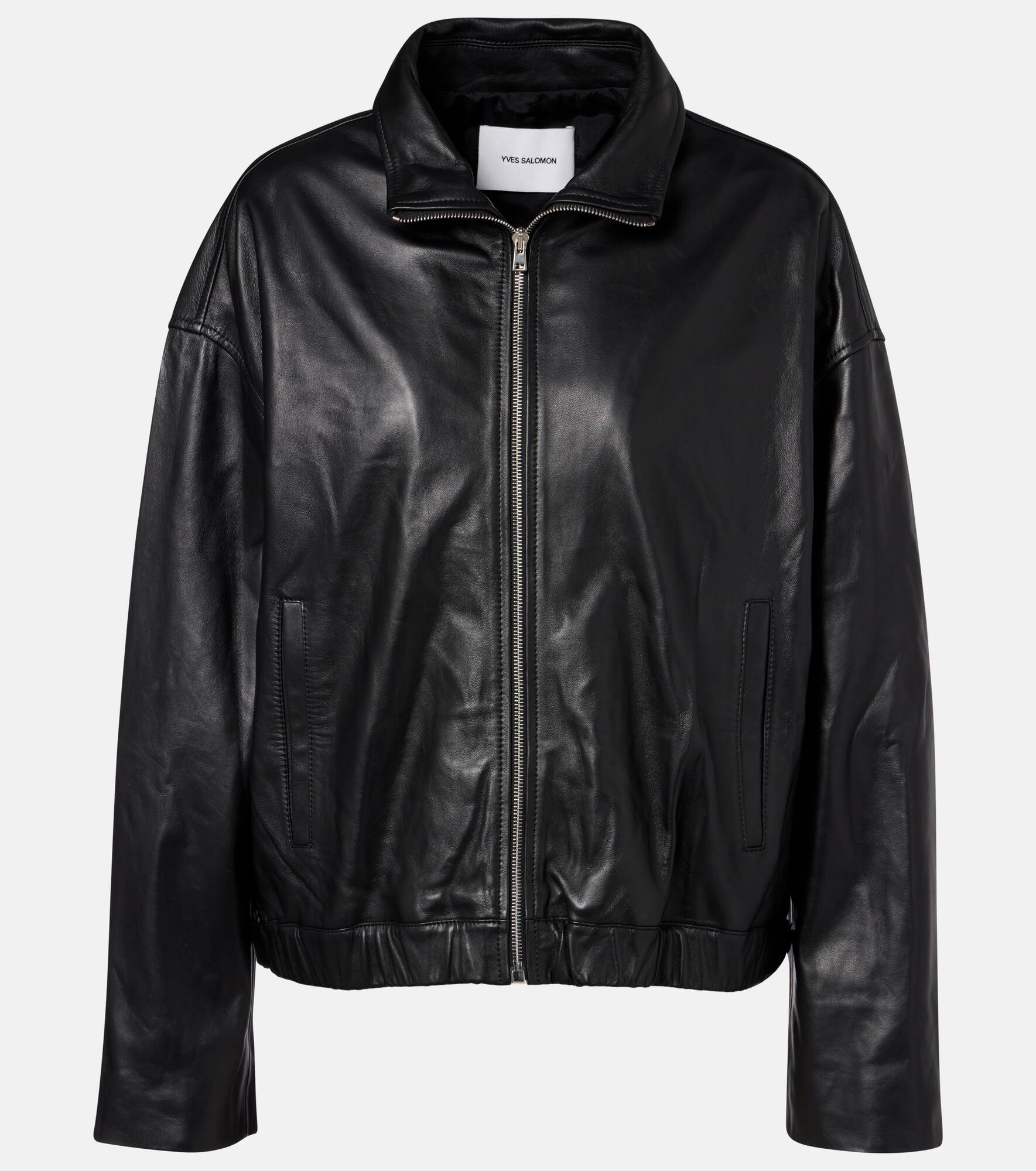 Rooted in a 100-year history, Yves Salomon's exquisite French craftsmanship produces winter wear that blends function and elegance. This jacket showcases a smooth leather construction, secured with a high neck and zipped front. Product Details - Material: 100% lamb leather - Care instructions: specialist clean - Made in France - Designer color name: Noir - Item color: black - Lining: 57% viscose, 43% polybutylene terephthalate - Hardware color: silver - Closure: zipped front - Pockets: welt pockets - Cuff: zipped - Hem: elasticated - Adjustable tabs at the waist - Fully lined - Includes: garment bag - Item number: P01096163 Size & Fit - True to size - Dropped shoulders - Designed for a loose fit - Elasticated hem - Non-stretchy fabric - Falls to the hip - The model seen in the picture is 178cm-5'10" and wearing a size FR 36