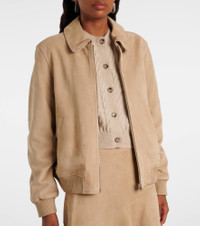 Rooted in a 100-year history, Yves Salomon's exquisite French craftsmanship produces winter wear that blends function and elegance. This bomber jacket is made from supple suede and features a zipped front, ribbed cuffs, and side welt pockets. Product Details - Material: 100% lamb leather (suede) - Care instructions: specialist clean - Made in France - Designer color name: Sandstorm - Item color: beige - Lining: 57% viscose, 43% polybutylene terephthalate - Hardware color: silver - Collar: classic (Straight point) - Closure: zipped front - Cuff: ribbed, elasticated - Hem: ribbed, elasticated - Fully lined - Includes: dust bag - Item number: P01096421 Size & Fit - True to size - Straight fit - Elasticated hem - Non-stretchy fabric - Falls to the hip - The model seen in the picture is 178cm-5'10" and wearing a size FR 36