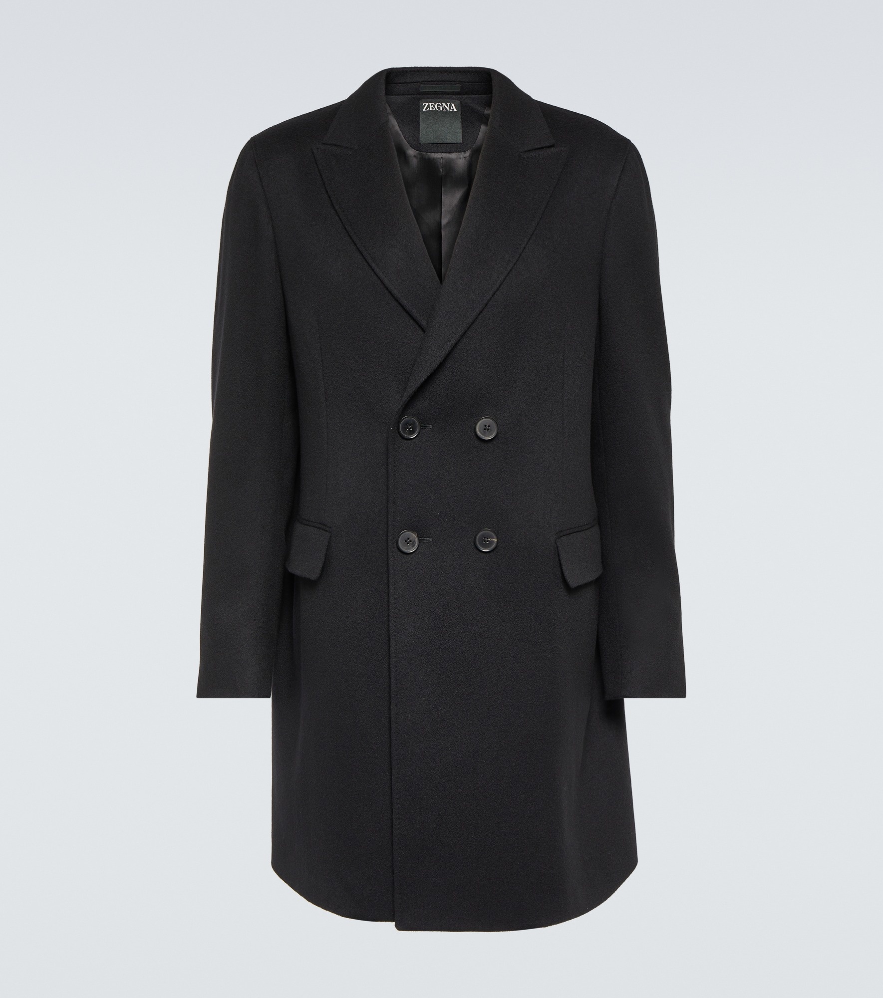 Established with the aim to create the world’s finest fabrics, Zegna is now the go-to brand for luxurious and innovative menswear. Made from a sumptuous blend of wool and cashmere, this coat has a double-breasted design. Product Details - Material: 88% wool, 8% cashmere, 4% elastane - Regular fit - Length: ¾ length - Peak lapel - Vent: single - Closure: double-breasted (four buttons) - Pockets: flap pockets, internal pockets - Mid-weight - Care instructions: dry clean - Made in Italy - Designer color name: Black - Lining: 100% partially lined - Overcoat - Jacket construction: structured - Shoulder construction: structured - Item number: P00828573 Size & Fit - True to size - Straight fit - Non-stretchy fabric - The model in the picture is 185cm-6'1" and wearing a size IT 48