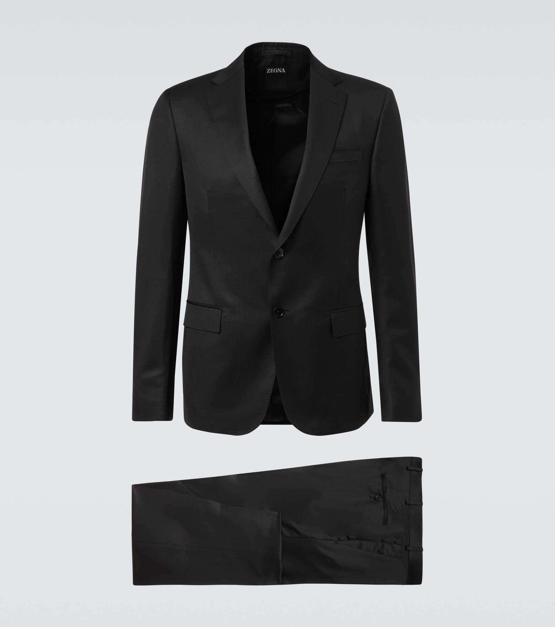 Established with the aim to create the world’s finest fabrics, Zegna is now the go-to brand for luxurious and innovative menswear. This exceptionally tailored suit is made from wool and mohair and comprises a single-breasted blazer and straight pants. Product Details - Material: 84% wool, 16% mohair - Care instructions: dry clean - Made in Italy - Designer color name: Black - Item color: black - Lining: 100% viscose - Two-piece set - Closure: single-breasted (two buttons), zipper fly, button and hook fastenings - Pockets: flap pockets, welt pocket, side slit pockets, back pockets - Belt loops - Item number: P01057743 Size & Fit - True to size - Shoulder pad inserts - Regular fit - Non-stretchy fabric - Falls below the hip - Straight leg - Unhemmed for tailoring - slit length 21cm-8.5" - The model in the picture is 185cm-6'1" and wearing a size IT 50