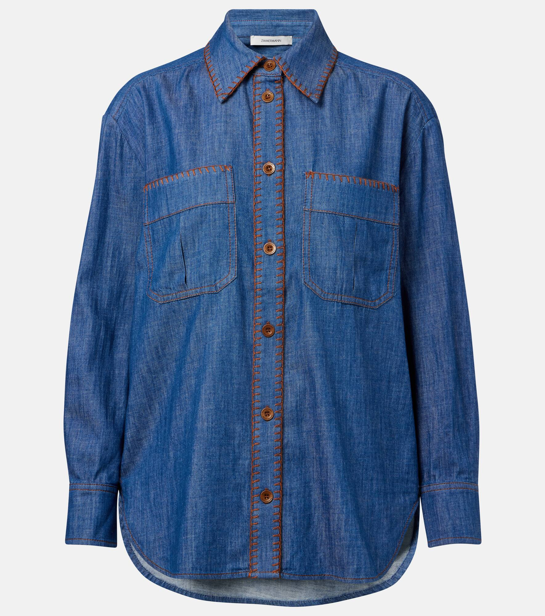 Every Zimmermann piece carries a romantic flair, lending it a distinct charm in your everyday wardrobe. The Ascension shirt is made of brown top-stitched denim and has an oversized silhouette for a refined yet relaxed look. Product Details - Material: 100% cotton - Care instructions: dry clean - Made in China - Designer color name: Railway Blue - Item color: blue - Closure: buttoned front - Pockets: patch pockets - Cuff: two buttons - Item number: P01062828 Size & Fit - True to size - Dropped shoulders - Designed for a loose fit - Non-stretchy fabric - Falls below the hip - The model seen in the picture is 178cm-5'10" and wearing a size 0