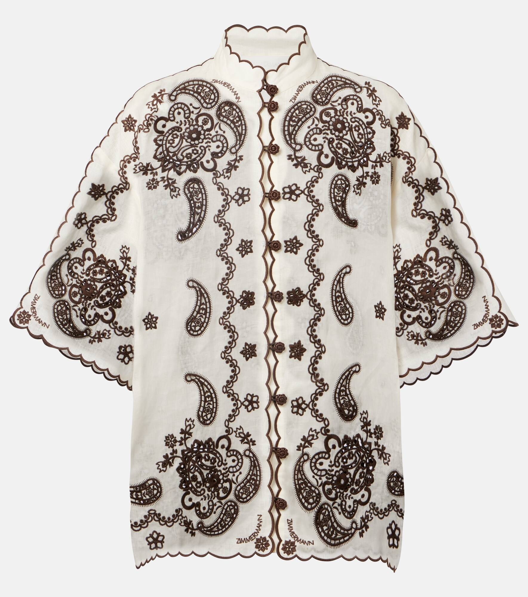 The Ascension shirt from Zimmermann lends sophistication to your warm-weather linens. This style features intricate embroidery detailing throughout, with scalloped edges and self-rouleau buttons down the centre front. Product Details - Material: 100% linen - Care instructions: dry clean - Made in China - Designer color name: Ivory/Chocolate - Item color: white, brown - Embroidery: 100% polyester - Closure: buttoned front - Item number: P01062813 Size & Fit - True to size - Dropped shoulders - Designed for a loose fit - Non-stretchy fabric - Falls below the hip - The model seen in the picture is 178cm-5'10" and wearing a size 0