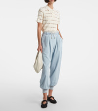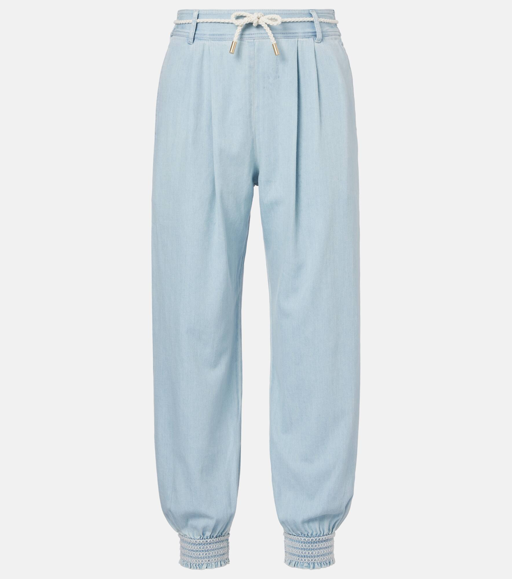 Made from lightweight denim, the Ascension jeans from Zimmermann are a comfortable fit for warm-weather days. The tapered style features a pleated front, elasticated ankle cuffs, and a drawstring waist. Product Details - Material: 100% cotton - Care instructions: machine wash at 30 degrees - Made in China - Designer color name: Ice Storm - Item color: blue - Item number: P01062901 Size & Fit - True to size - Elasticated waist - Adjustable at the waist - Non-stretchy fabric - Tapered leg - The model seen in the picture is 178cm-5'10" and wearing a size 0