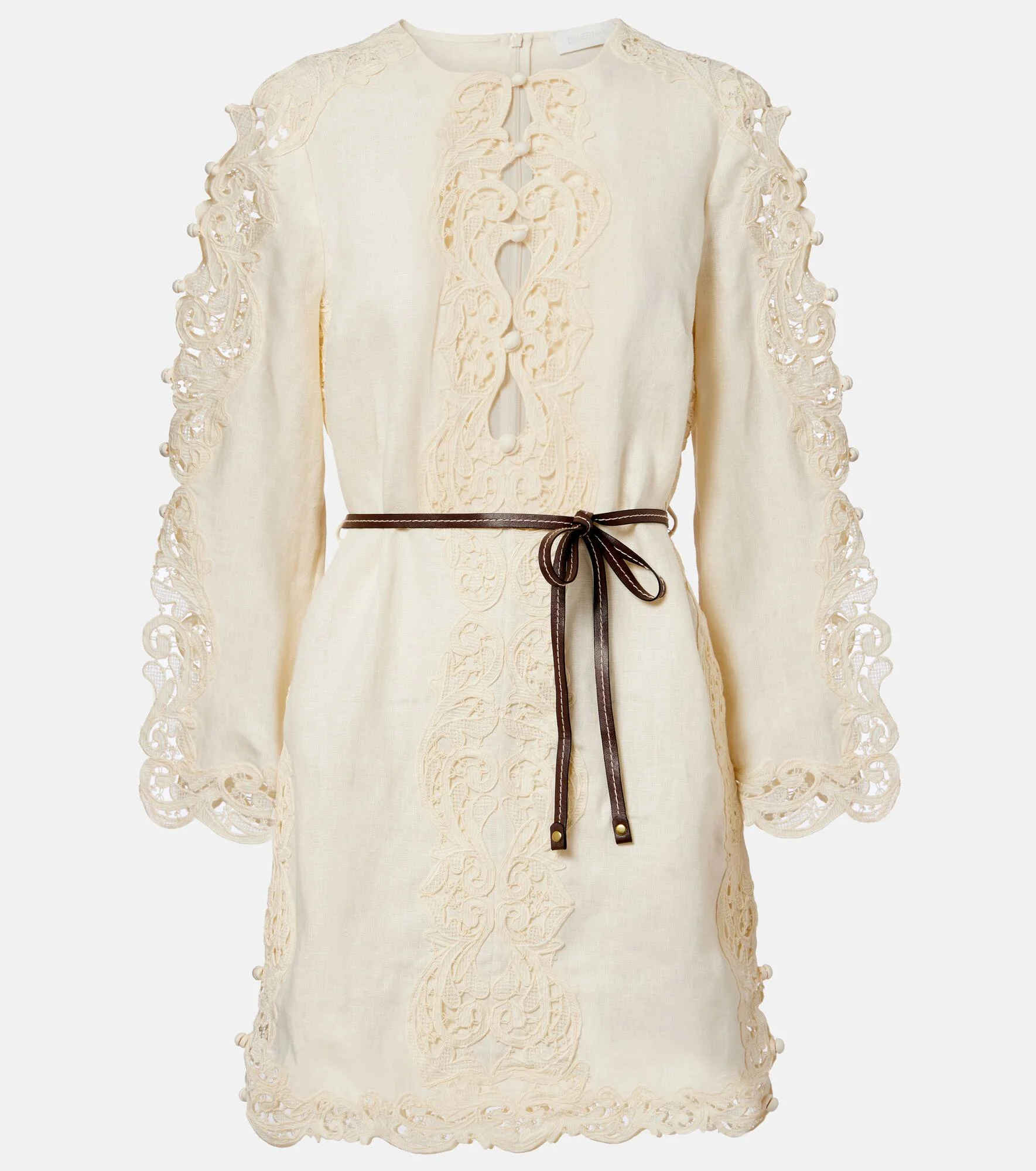 Ethereal and romantic barely scratch the surface when describing a Zimmermann piece. Crafted from linen, the Awaken minidress boasts a detachable leather belt at the waist, keyhole cutouts at the neckline, and intricate all-over embroidery. Product Details - Material: 100% linen - Care instructions: dry clean - Made in China - Color: white - Designer color name: Cream - Trim: 100% polyester - Detachable belt - Closure: buttoned front, concealed zipped back - Item number: P01129811 Size & Fit - True to size - Semi-sheer - Straight fit - Adjustable at the waist - Non-stretchy fabric - The model seen in the picture is 178cm-5'10" and wearing a size 0