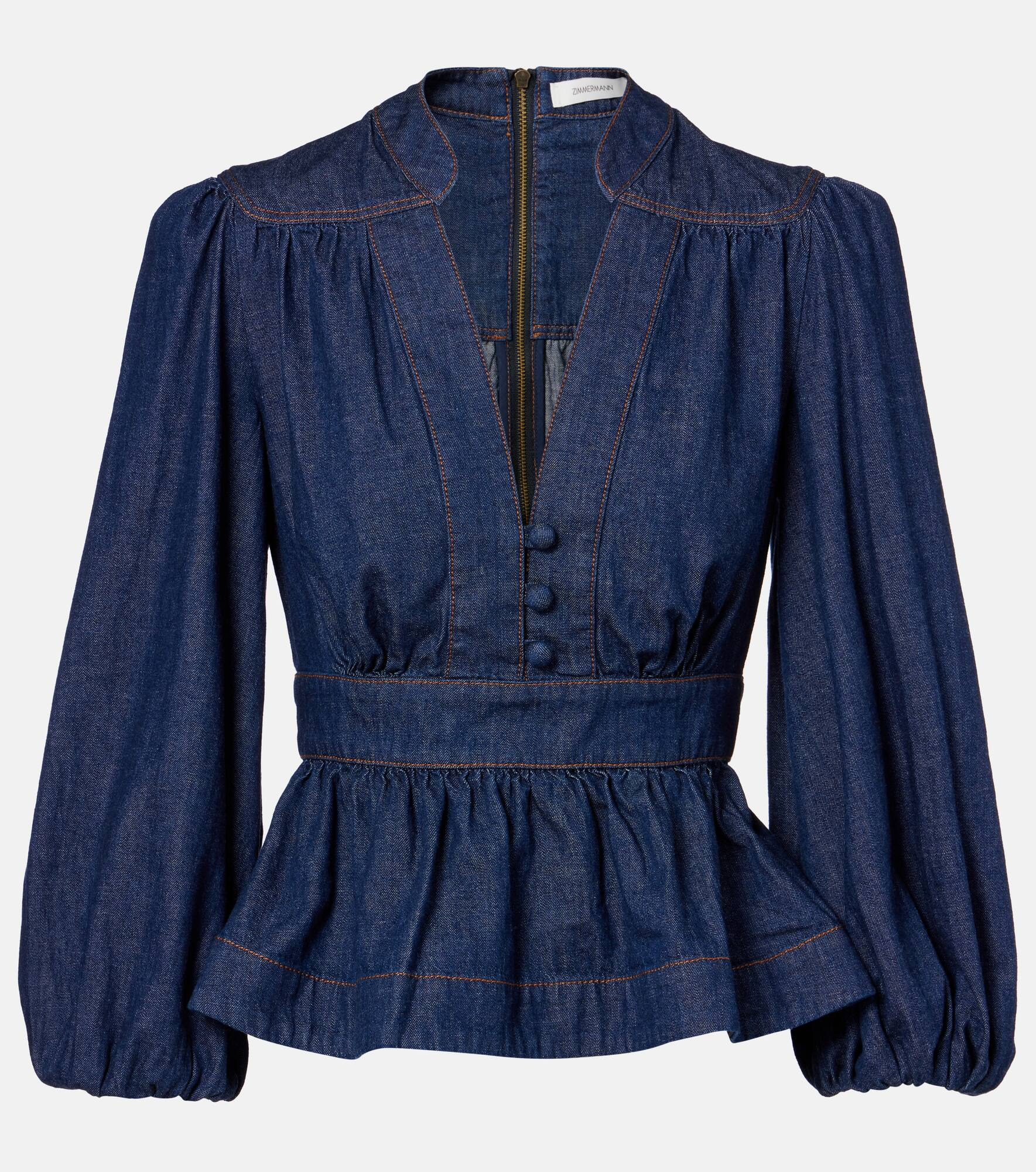 Ethereal and romantic barely scratch the surface when describing a Zimmermann piece. Crafted from denim, the Awaken blouse features a deep V-neckline, bell sleeves, and a flared peplum hem. Product Details - Material: 100% cotton - Care instructions: machine wash at 30 degrees - Made in China - Designer color name: Ink - Item color: blue - Cuff: elasticated - Collar: V-neck - Closure: concealed zipped back, partially buttoned front - Item number: P01129827 Size & Fit - Fits large to size - we recommend trying one size smaller - Cinched waist - Non-stretchy fabric - Falls to the hip - The model seen in the picture is 178cm-5'10" and wearing a size 00