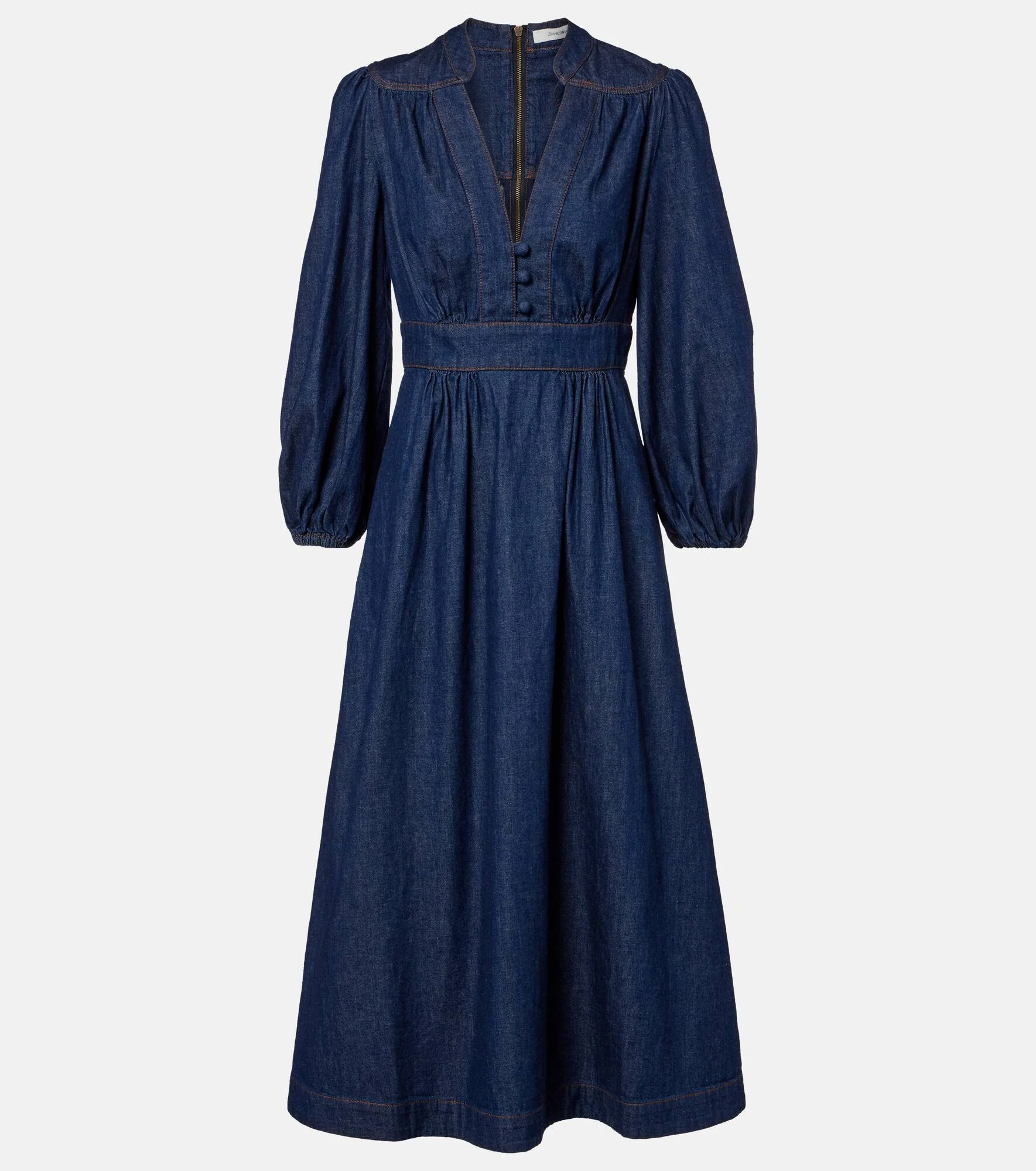 Ethereal and romantic barely scratch the surface when describing a Zimmermann piece. The Awaken denim midi dress features a deep V-neckline, voluminous sleeves, and a fit-and-flare silhouette. Product Details - Material: 100% cotton - Care instructions: dry clean - Made in China - Designer color name: Ink - Item color: blue - Collar: V-neck - Cuff: elasticated - Pockets: side slit pockets - Closure: concealed zipped back, partially buttoned front - Item number: P01129829 Size & Fit - True to size - Cinched waist - Non-stretchy fabric - The model seen in the picture is 178cm-5'10" and wearing a size 0