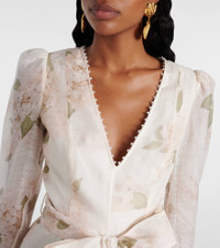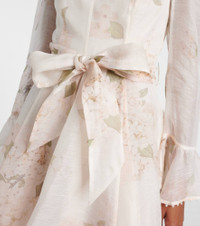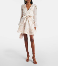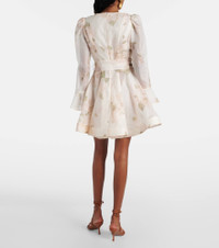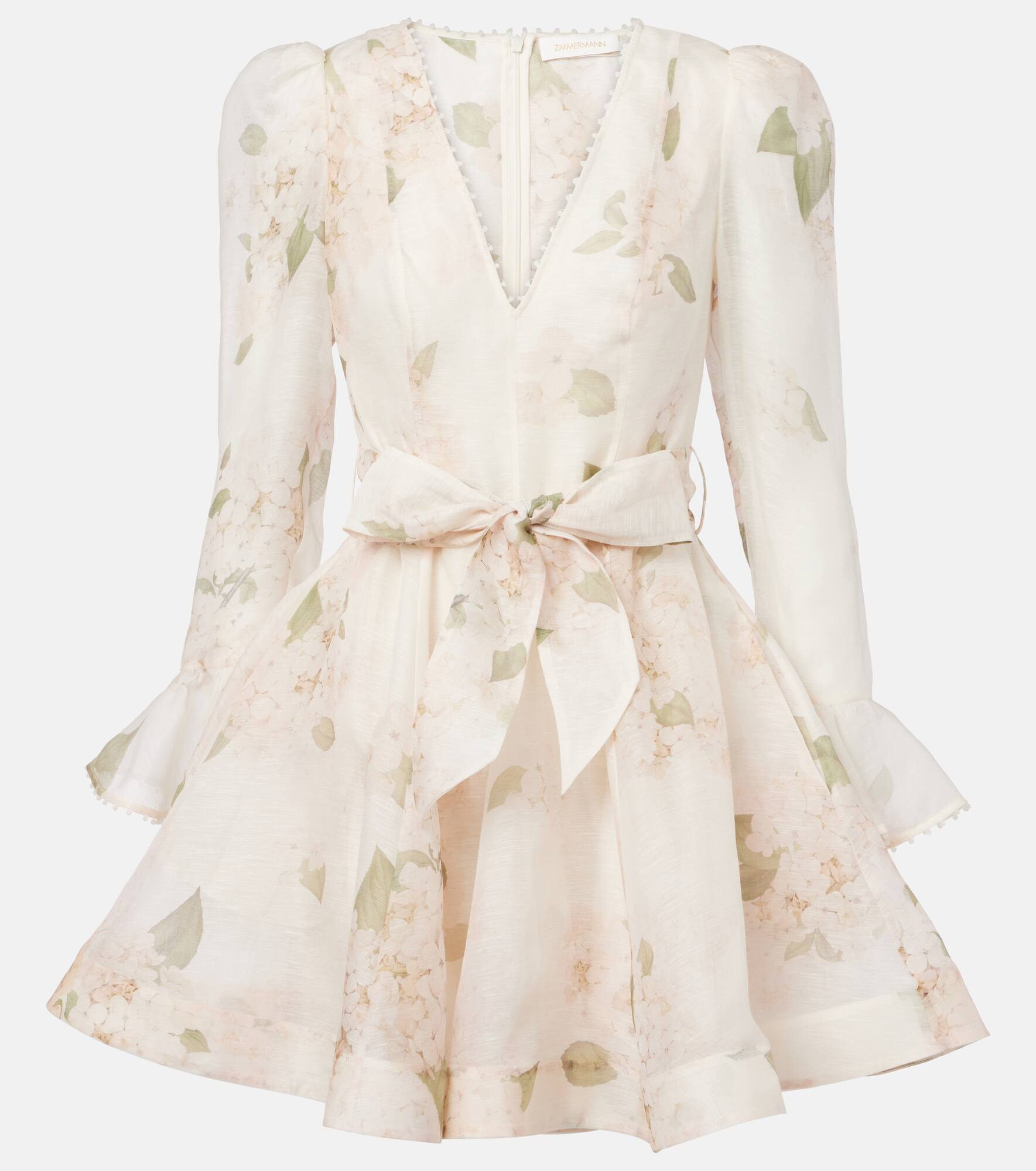 Ideal for a garden party or a refined elegant event alike, the Balance minidress from Zimmermann is a charming choice. Made from a linen and silk blend, this style features a plunging V-neckline, frill details at the cuffs, and self ties at the waist. Product Details - Material: 52% linen, 48% silk - Care instructions: dry clean - Made in China - Designer color name: White Hydrangea - Item color: white - Lining: 100% linen - Fully lined - Contains non-textile parts of animal origin - Item number: P01041040 Size & Fit - True to size - Cinched waist - Non-stretchy fabric - The model seen in the picture is 178cm-5'10" and wearing a size 0