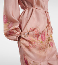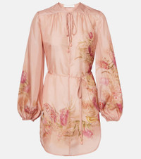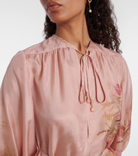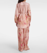 The Cascadian tunic by Zimmermann is crafted from airy silk and adorned with a charming botanical print. This piece features a V-neckline with an adjustable self-tie collar, a hook closure, and elasticated cuffs. Product Details - Material: 100% silk - Care instructions: dry clean - Made in Vietnam - Designer color name: Pink Botanical Floral - Item color: pink, multicolor - Hardware color: pink, gold - Hem: rounded - Closure: hook-fastening front, self-ties - Collar: V-neck - Cuff: elasticated - Item number: P01062883 Size & Fit - True to size - Loose fit, comes with belt - Non-stretchy fabric - Falls below the hip - The model seen in the picture is 178cm-5'10" and wearing a size 0