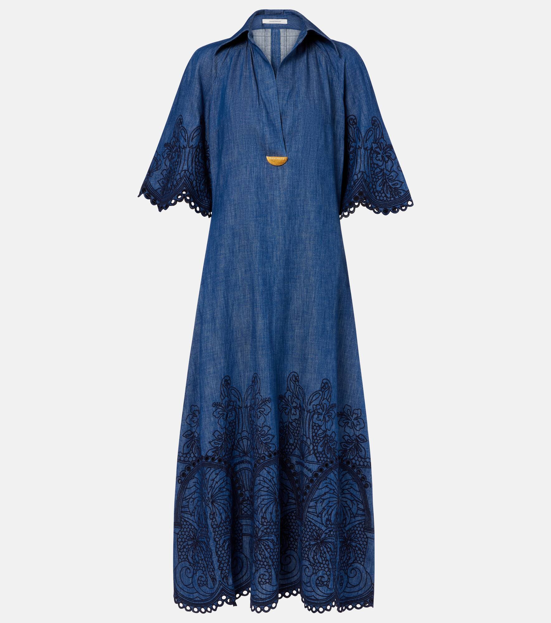 Ethereal and romantic barely scratch the surface when describing a Zimmermann piece. The Coco denim maxi dress is embroidered with lace trimmings on the sleeves and skirt. The design has side pockets for additional functionality. Product Details - Material: 100% cotton - Care instructions: machine wash at 30 degrees - Made in China - Designer color name: Railway Blue - Item color: blue - Embroidery: 100% polyester - Hardware color: brass - Item number: P01062848 Size & Fit - True to size - Cinched waist - Non-stretchy fabric - The model seen in the picture is 178cm-5'10" and wearing a size 0