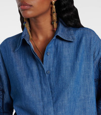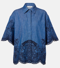 Ethereal and romantic barely scratch the surface when describing a Zimmermann piece. The Coco denim shirt is trimmed with lace embroidery and is finished with scalloped edges. The design has concealed buttons down the centre front. Product Details - Material: 100% cotton - Care instructions: machine wash cold - Made in China - Designer color name: Railway Blue - Item color: blue - Closure: concealed buttoned front - Item number: P01062858 Size & Fit - True to size - Dropped shoulders - Designed for a loose fit - Non-stretchy fabric - Falls to the hip - The model seen in the picture is 178cm-5'10" and wearing a size 0