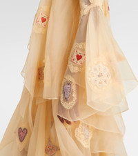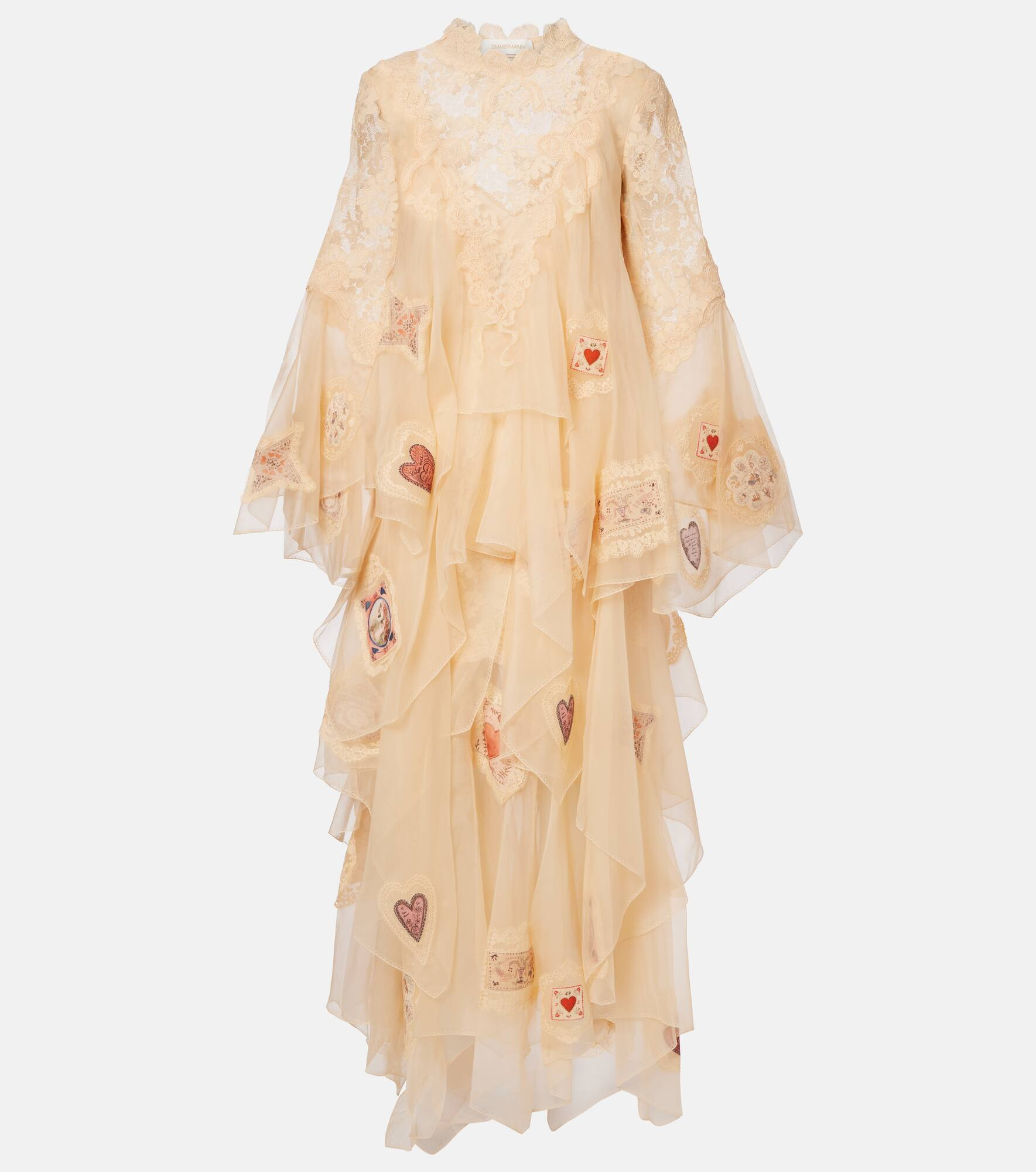 Ethereal and romantic barely scratch the surface when describing the Hypnotic Cascading gown by Zimmermann. The design is made from airy layers of silk organza and features heart-shaped embroidery along the hem and love letter patches throughout. Product Details - Material: 100% silk - Care instructions: dry clean - Made in China - Designer color name: Cream - Item color: yellow - Lace: 100% polyester - Lining: 86% polyester (recycled), 14% elastane - Closure: invisible zipper - Item number: P01101527 Size & Fit - True to size - Straight fit - Non-stretchy fabric - The model seen in the picture is 178cm-5'10" and wearing a size 0
