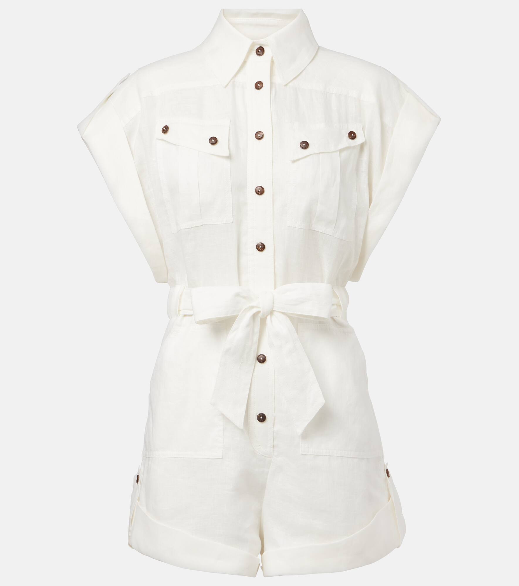 Enjoy the warm season with staple yet elegant pieces such as this white playsuit from Zimmermann. Made from pure linen, the belted style has a buttoned front and structured shoulders. Product Details - Material: 100% linen - Care instructions: dry clean - Made in China - Designer color name: Ivory - Item color: white - Closure: buttoned front - Pockets: breast pockets, side slit pockets - Self-tie belt - Belt loops - Item number: P01062889 Size & Fit - True to size - Semi-sheer - Loose fit, comes with belt - Non-stretchy fabric - Wide-leg - High-waisted - The model seen in the picture is 178cm-5'10" and wearing a size 0