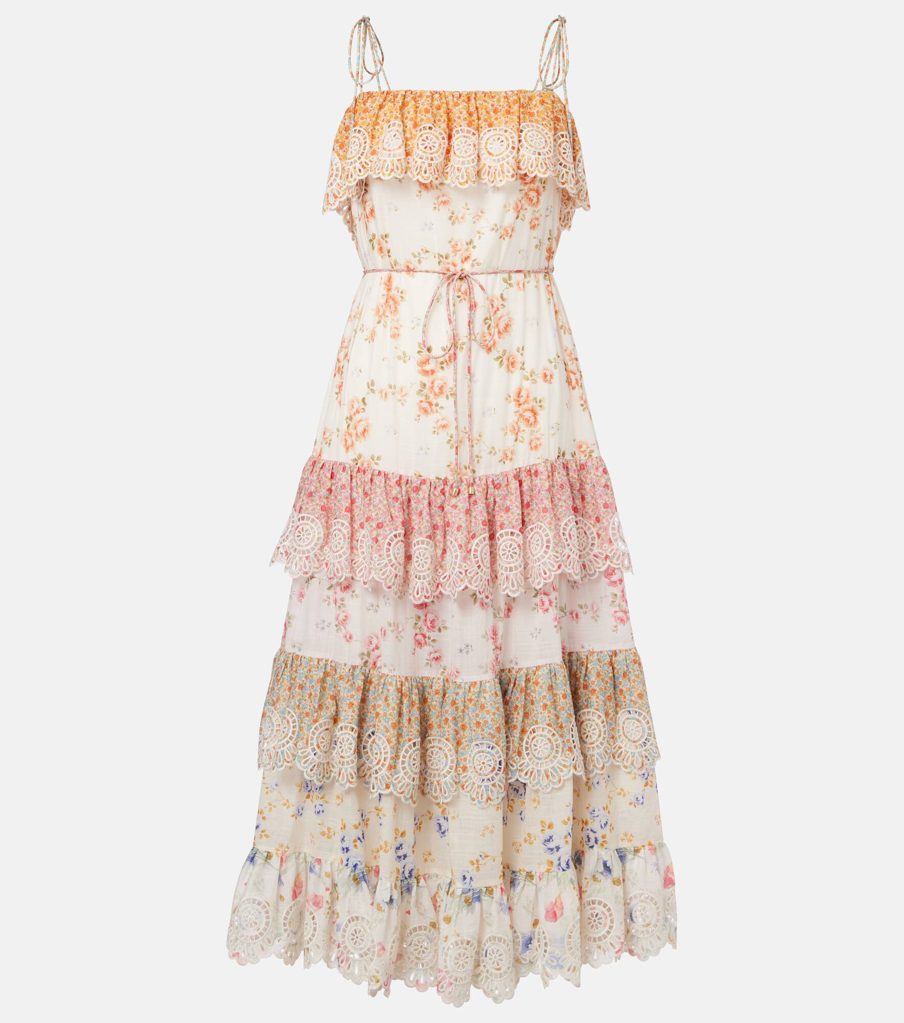Ethereal and romantic barely scratch the surface when describing this Zimmermann piece. The Lucky dress is crafted from cotton with a gentle floral motif and cascades to the floor in an elegant tiered silhouette. Product Details - Material: 100% cotton - Care instructions: dry clean - Made in China - Designer color name: Spliced - Item color: multicolor - Trim: 100% polyester - Lining: 100% cotton - Partially lined - Item number: P01062790 Size & Fit - True to size - Loose fit, comes with belt - Non-stretchy fabric - The model seen in the picture is 178cm-5'10" and wearing a size 0