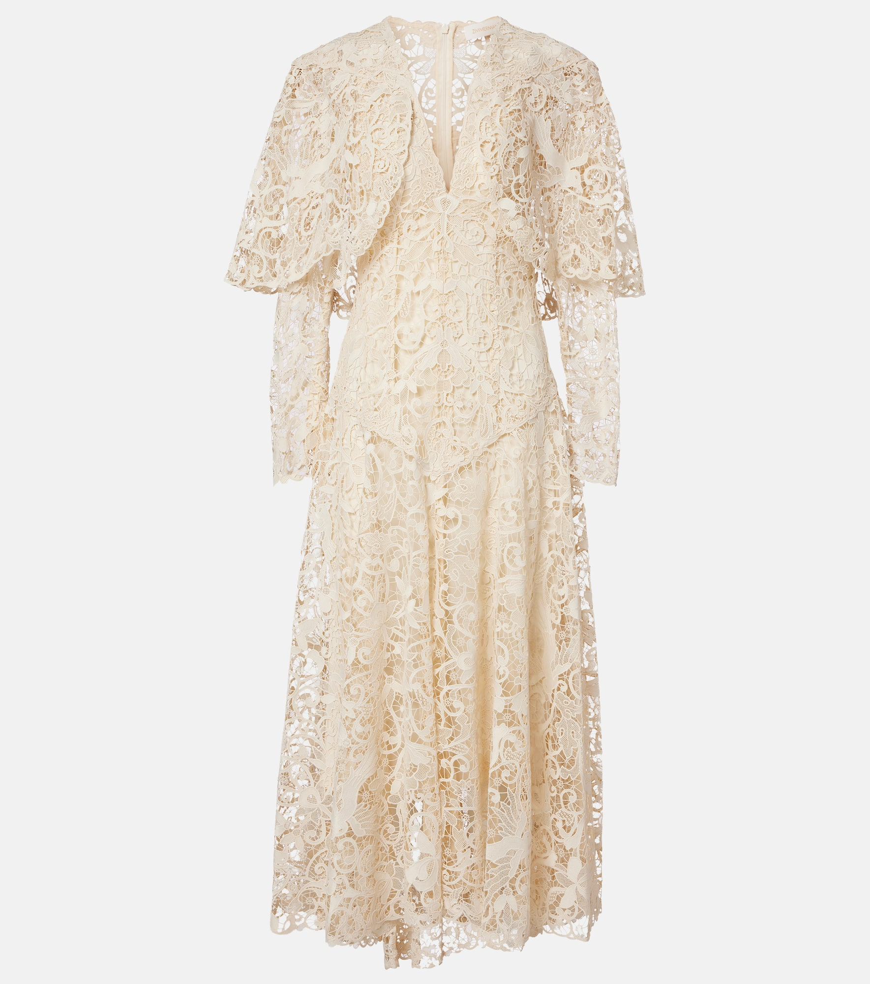 The Memento midi dress from Zimmermann is crafted from lace and features a plunging V-neckline, a cropped cape overlay, and long sleeves with scalloped edges and zipped cuffs. The style is finished with a detachable lining and a concealed zipper. Product Details - Material: 100% polyester - Care instructions: dry clean - Made in China - Designer color name: Cream - Item color: white - Collar: V-neck - Closure: zipped back - Hem: scalloped - Detachable lining - Cuff: zipped - Item number: P01101539 Size & Fit - True to size - Semi-sheer - Cinched waist - Loose outer layer - Non-stretchy fabric - The model seen in the picture is 178cm-5'10" and wearing a size 0