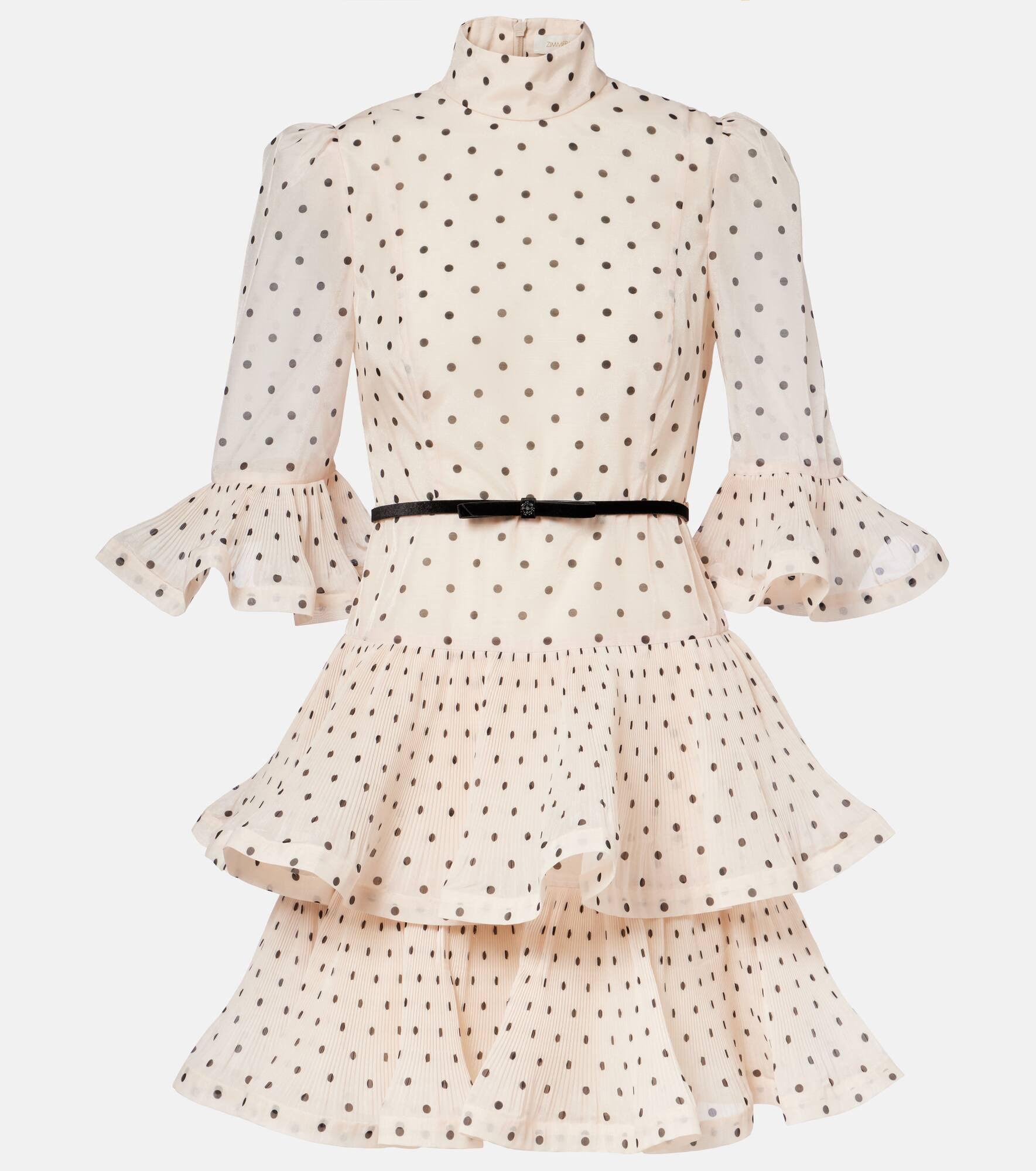 Ethereal and romantic barely scratch the surface when describing a Zimmermann piece. Designed with playful polka-dots, this minidress boasts a high collar, a removable belt, cascading ruffles, and a tiered pleated skirt that moves beautifully. Product Details - Material: 100% polyester - Care instructions: dry clean - Made in China - Designer color name: Cream/Black Polka Dot - Item color: beige, black - Lining: 100% cotton - Sleeves: ¾ length - Cuff: frilled - Attached belt - Closure: concealed zipper, zipped back - Item number: P01101109 Size & Fit - Fits large to size - we recommend trying one size smaller - Cinched waist - Non-stretchy fabric - The model seen in the picture is 178cm-5'10" and wearing a size 00