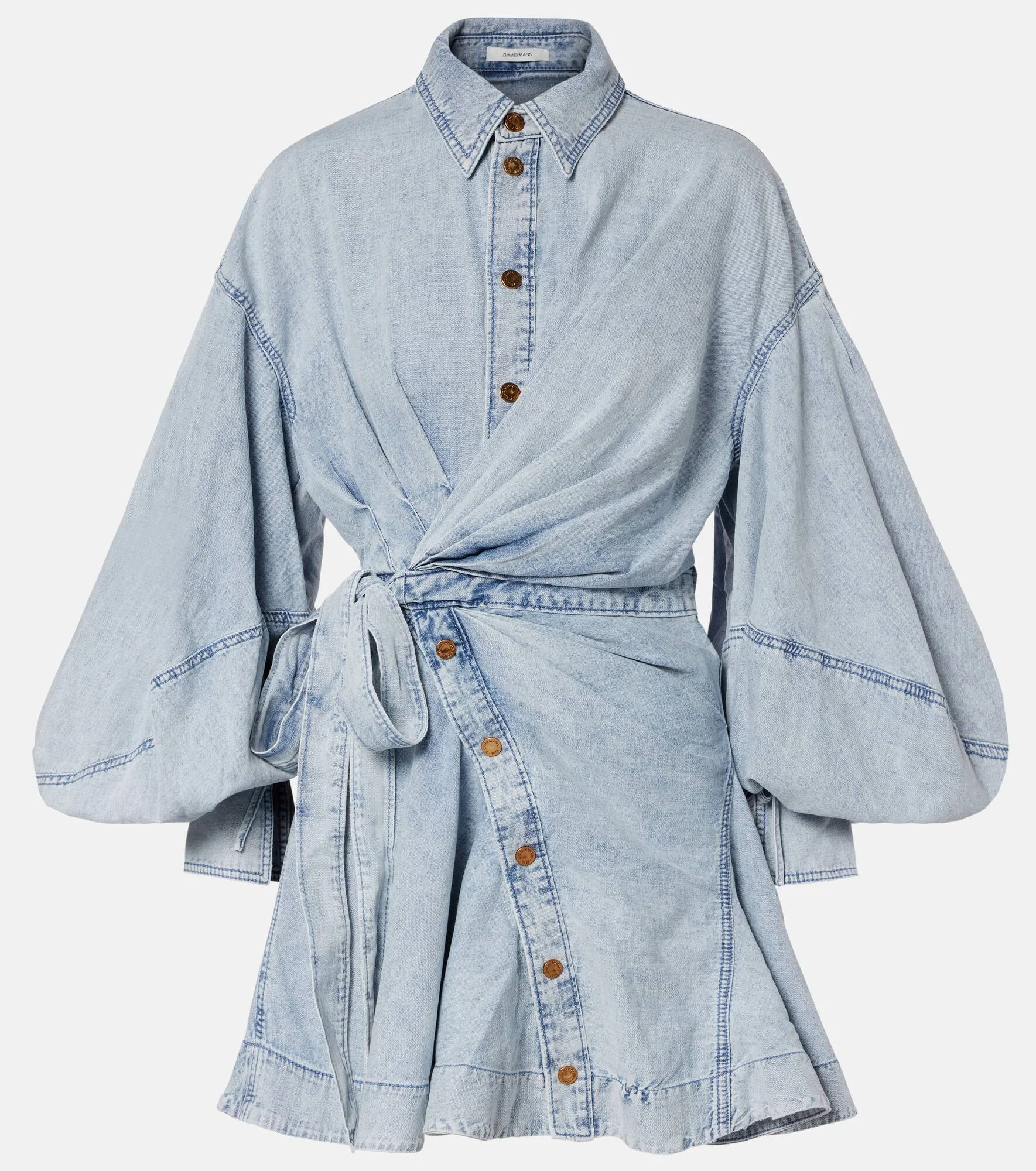 Ethereal and romantic barely scratch the surface when describing a Zimmermann piece. Crafted from denim, the Rebellion minidress features a charming wrapped silhouette with billow sleeves and gold-toned buttons. Product Details - Material: 100% cotton - Care instructions: machine wash at 30 degrees - Made in China - Color: blue - Designer color name: Castaway - Item color: blue - Lining: 86% polyester, 14% cotton - Hardware color: gold - Closure: snap-buttoned front, wrap-front - Collar: classic (Straight point) - Cuff: strapped - Item number: P01129771 Size & Fit - True to size - Dropped shoulders - Cinched waist - Adjustable at the waist - Non-stretchy fabric - The model seen in the picture is 178cm-5'10" and wearing a size 0