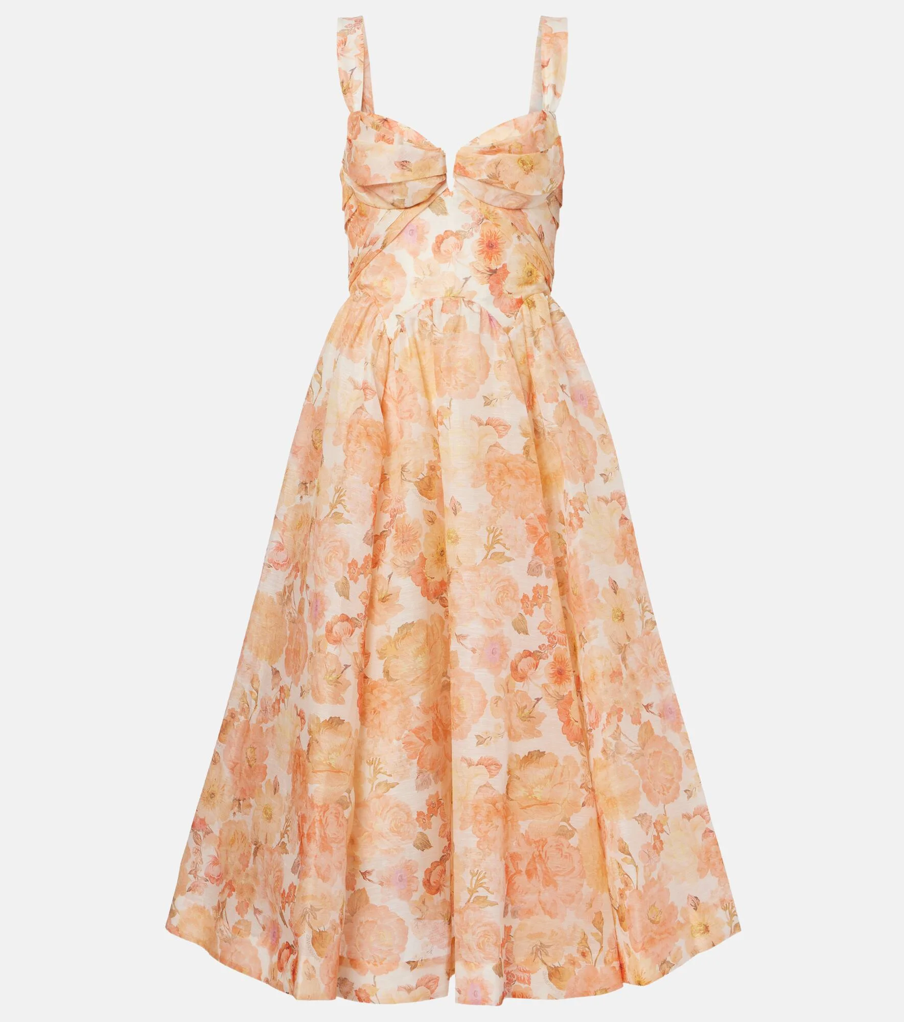 Ethereal and romantic barely scratch the surface when describing a Zimmermann piece. This Rebellion midi dress is crafted from a blend of linen and silk, decorated with a vibrant floral print throughout. Product Details - Material: 55% linen, 45% silk - Care instructions: dry clean - Made in China - Designer color name: Golden Bloom - Item color: orange - Lining: 100% cotton - Interlining: 100% polyester - Material II: 100% polyester - Closure: concealed zipped back - Underwired cups - Boning - Item number: P01129782 Size & Fit - True to size - Elasticated top - Cinched waist - Non-stretchy fabric - The model seen in the picture is 178cm-5'10" and wearing a size 0