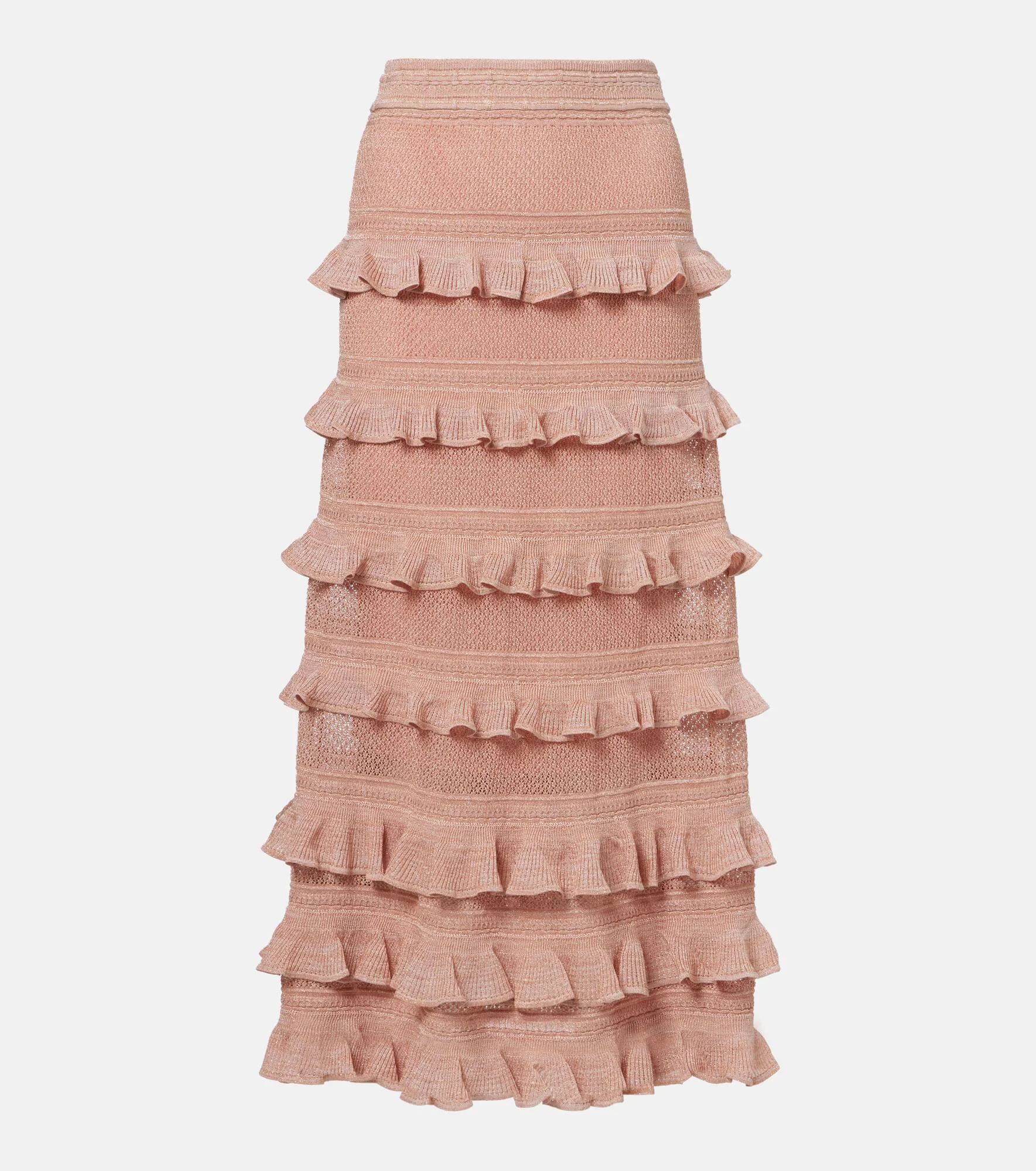 Ethereal and romantic barely scratch the surface when describing a Zimmermann piece. This Rebellion skirt showcases a shiny lame construction and midi-length silhouette, complemented by ribbed panels and tiered ruffles throughout. Product Details - Material: 53% viscose, 34% polyester, 13% metallic fibres - Care instructions: dry clean - Made in China - Designer color name: Metallic Rose Gold - Item color: pink - Elasticated waistband - Trim: 38% viscose, 30% polyester, 23% polyamide, 9% metallic fibres - Lining: 100% viscose - Item number: P01129794 Size & Fit - True to size - Elasticated waist - Slightly stretchy fabric - The model seen in the picture is 178cm-5'10" and wearing a size 0