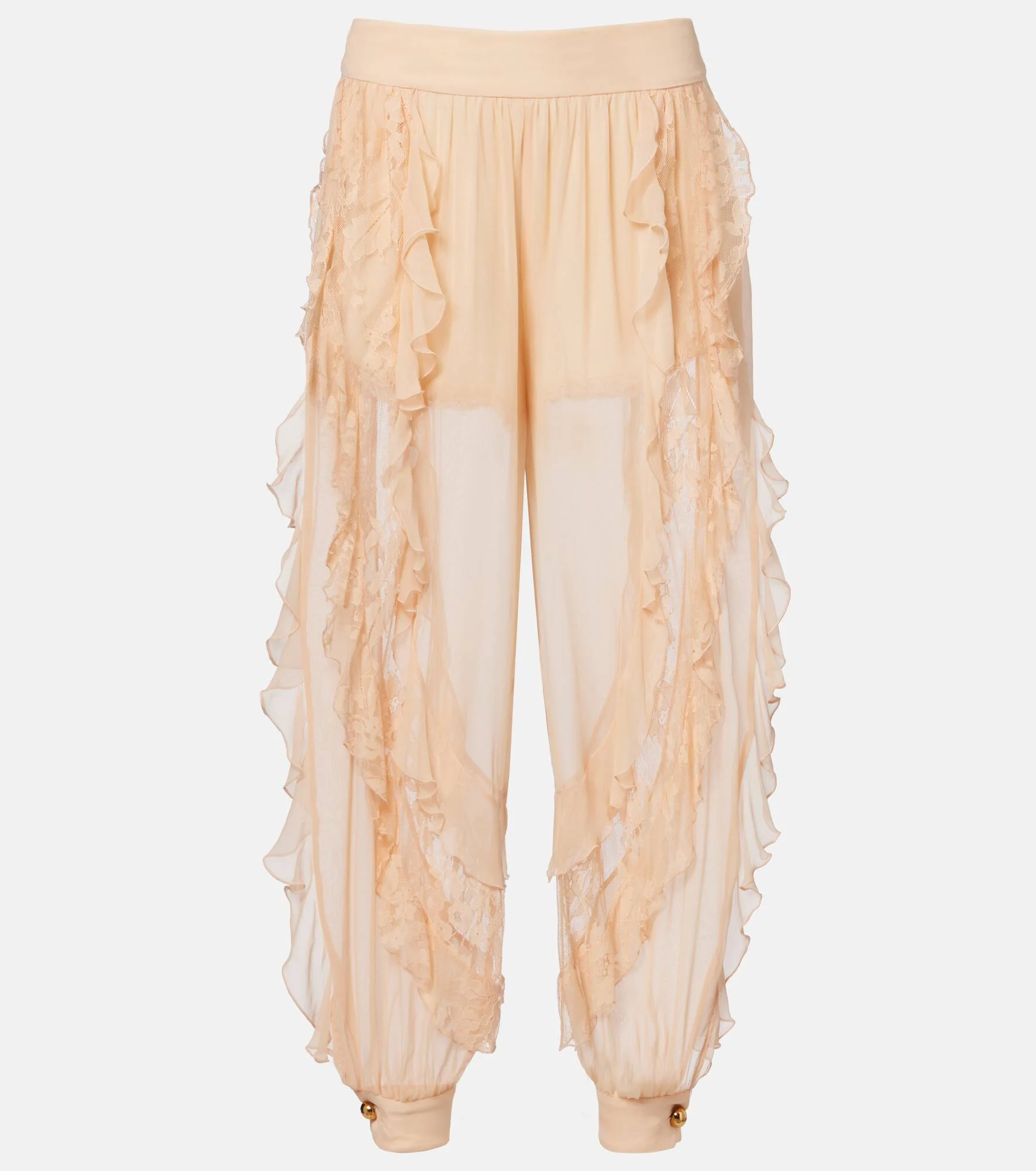 Elegant silhouettes and delicate details define Zimmermann's designs, including the Rebellion pants. Made from fluid silk, they feature wide legs accented with lace trims and cascading ruffles for added movement. Product Details - Material: 100% silk - Care instructions: dry clean - Made in China - Designer color name: Peach - Item color: pink - Lace: 60% polyamide, 40% cotton - Lining: 100% viscose - Closure: invisible zipper - Item number: P01129770 Size & Fit - True to size - Semi-sheer - Non-stretchy fabric - Tapered leg - The model seen in the picture is 178cm-5'10" and wearing a size 0