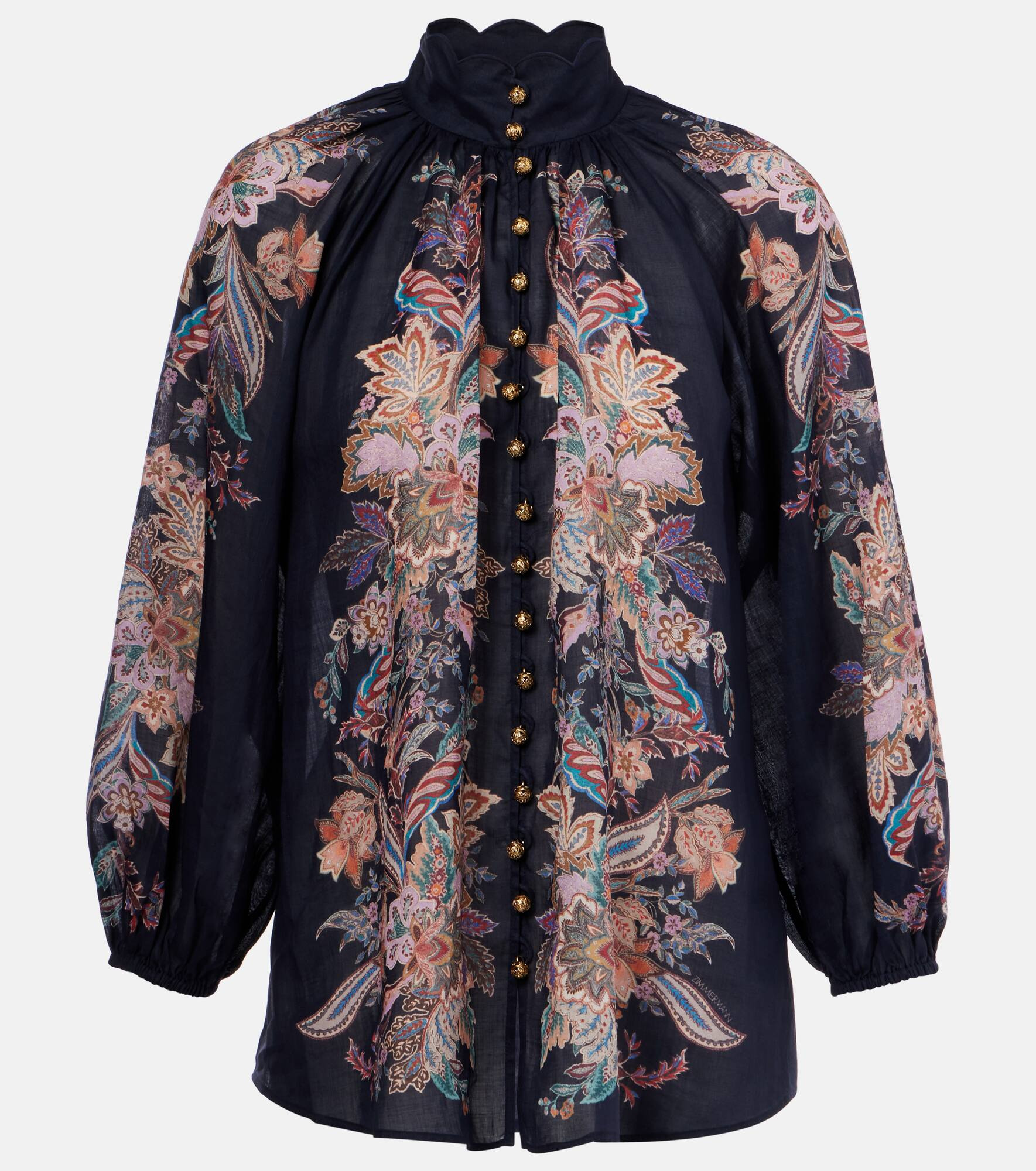 Ethereal and romantic barely scratch the surface when describing a Zimmermann piece. Decorated with an intricate paisley print, this refined ramie blouse features a high neck, scalloped edging, and billow sleeves. Product Details - Material: 100% ramie - Care instructions: dry clean - Made in China - Designer color name: Navy Multi Paisley - Item color: blue, multicolor - Closure: buttoned front - Item number: P01062442 Size & Fit - True to size - Designed for a loose fit - Non-stretchy fabric - Falls below the hip - The model seen in the picture is 178cm-5'10" and wearing a size 0