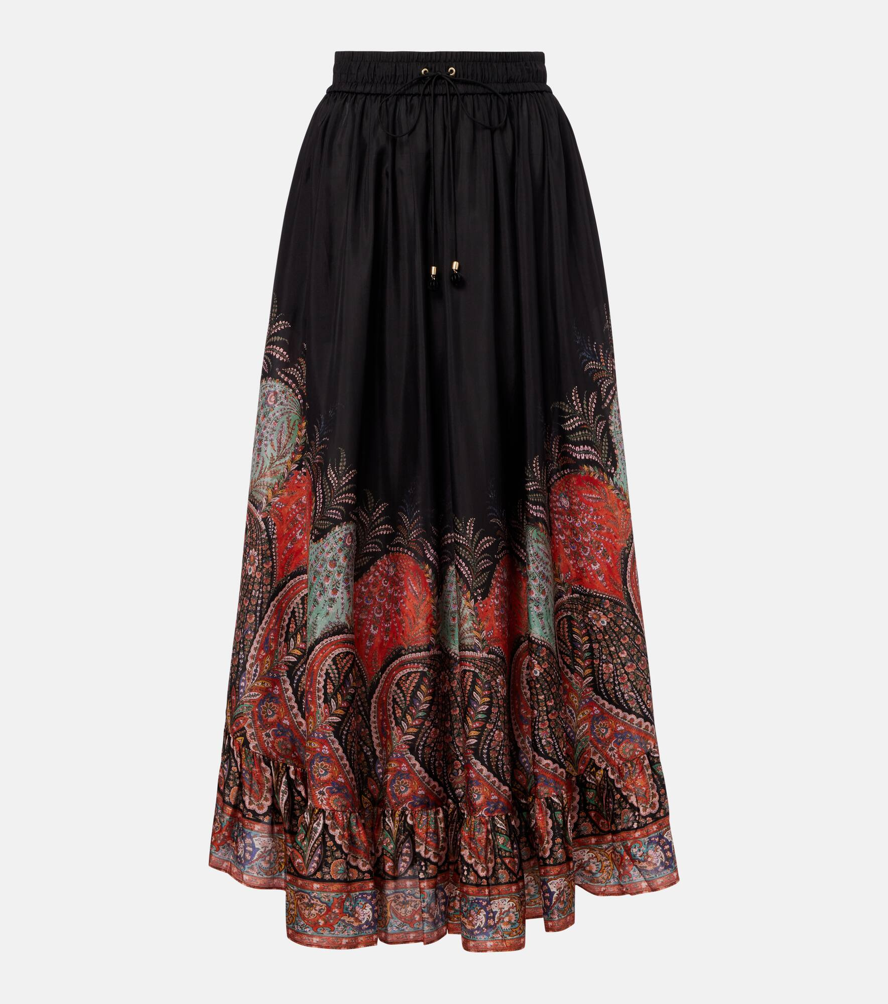 The Rhiannon maxi skirt from Zimmerman is crafted from pure silk and showcases ruffled details at the hem. This design features an allover print as well as a drawstring waist and side-slit pockets. Product Details - Material: 100% silk - Care instructions: dry clean - Made in China - Designer color name: Black Paisley - Item color: multicolor - Elasticated drawstring waist - Pockets: side slit pockets - Item number: P01062749 Size & Fit - True to size - Elasticated waist - Adjustable at the waist - Non-stretchy fabric - The model seen in the picture is 178cm-5'10" and wearing a size 0
