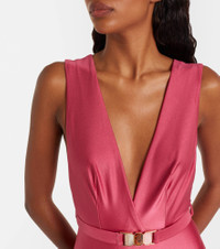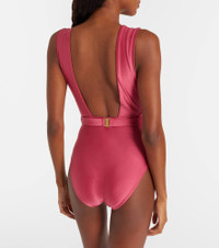 Ethereal and romantic barely scratch the surface when describing a Zimmermann piece. The Wanderlust belted swimsuit comes in a bright pink-hue and features a deep V-neckline. Product Details - Material: 80% polyamide, 20% elastane - Care instructions: hand wash - Made in Vietnam - Designer color name: Deep Rose - Item color: pink - Lining: 92% nylon (recycled), 8% elastane - Hardware color: gold - Collar: V-neck - Item number: P01129837 Size & Fit - True to size - Unpadded Top - Medium-cut leg - The model seen in the picture is 178cm-5'10", cup size B, and wearing a size 0