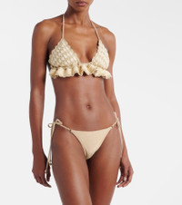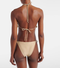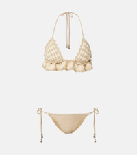 Ethereal and romantic barely scratch the surface when describing a Zimmermann piece. The Wanderlust bikini boasts a triangle-shaped crochet top and low-rise lame bottoms. Product Details - Material: 48% viscose, 43% cotton, 9% metallic fibres - Care instructions: hand wash - Made in China - Color: white - Designer color name: Metallic Gold Cream - Material II: 65% polyester, 15% metallic fibres, 13% polyamide, 7% elastane - Lining: 92% nylon (recycled), 8% elastane - Two-piece set - Closure: self-ties - Item number: P01129836 Size & Fit - True to size - Unpadded Top - Minimal coverage - High-cut leg - The model seen in the picture is 178cm-5'10", cup size B, and wearing a size 0