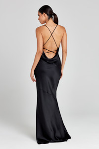 ABIGAIL is an elegant, floor-sweeping illusion panel maxi dress, crafted from satin with a cowl neckline, seam panel detailing, and a cowl back with cross-body functional ties. - Black satin fabric - Cowl neckline to the front and back - Illusion seam panel detailing - Functional thin straps and cross-body ties to the back - Fully lined - Outer:100% Polyester, Lining: 100% Polyester Size & Fit Information - Item runs to our size chart. Please refer here for the best fit. - Model is 175cm/5'9" wearing 4" heels and a size S - Length from Apex to hem is 142cm based on Size XS - Stretch Factor: No Stretch