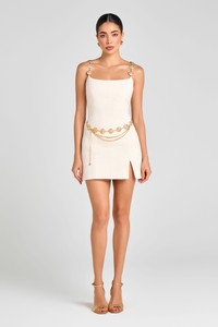 The ALEX Ivory Dress is crafted from cream boucle-tweed with a subtle shimmer thread running through and features a sculpted fitted silhouette with a front slit for added edge. The square neckline at the front and V-back create a flattering contrast, while seam detailing throughout enhances the figure. Embossed coin adorned chain straps add a bold touch, with elasticated backs for comfort and ease. Style it with or without the detachable layered chain belt for a refined flair. - Cream boucle-tweed fabrication with shimmer thread running through - Square neckline at front, V-neckline at back - Fitted mini silhouette, with slight slit at front - Seam detailing at front and back for a sculpted finish - Embossed circular chain straps, with elasticated back for comfort and fit - Concealed zip closure at back - Fully lined in satin - Detachable layered coin adorned chain belt - Outer: 100% Polyester, Lining: 97% Polyester 3% Elastane Size & Fit Information - Item runs to our size chart. Please refer here for the best fit -Designed to be fitted to the bust and waist with a flowing skirt - Model is 176cm/5'8" wearing 4" heels and a size S - Stretch Factor: No Stretch