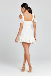 ANNIE is an elegant, feminine mini dress crafted from broderie anglaise fabric. Featuring straps to be worn on and off the shoulders, to be styled with or without the frill strap. This style includes external piping detailing to the bodice, a detachable belt with a wooden buckle, shirring to the back for a more comfortable fit, and frills at the hem. This style is finished with a concealed zip closure to the back. - Broderie anglaise fabrication - External piping detailing on the bodice - Interchangeable straps - Detachable belt with wooden buckle detailing - Shirring to the back - Frills to the hem - Concealed zip closure - Fully lined Size & Fit Information - Item runs to our size chart. Please refer here for the best fit - Model is 175cm/ 5'9 " and wearing 4" heels and size S - Stretch Factor: No Stretch