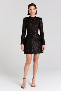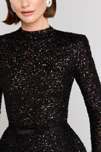 EDIE is a high-neck mini dress, crafted from a black sheer embellished beaded fabric, lined in mesh. Featuring internal shoulder pads, full-length sleeves, and our signature tulip style skirt. Finished with a concealed zip closure to the centre back, and a detachable and adjustable belt featuring a black satin bow. Fully lined in mesh for a smooth fit. - Black sheer embellished beaded fabric - Signature tulip style mini skirt - High neckline - Internal shoulder pads - Full-length sleeves - Concealed zip closure to the centre back - Nude mesh lining - Tonal underwear required Size & Fit Information - Item runs to our size chart. Please refer here for the best fit. - Model is 179cm/ 5ft 9 wearing 4.5” heels and size XS - Stretch Factor: No Stretch