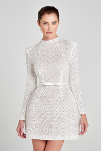 EDIE is a high-neck mini dress, crafted from a sheer pearl embellished white fabric, lined in mesh. Featuring internal shoulder pads, full-length sleeves, and our signature tulip style skirt. Finished with a concealed zip closure to the centre back, and a detachable and adjustable belt featuring a white satin bow. Fully lined in mesh for a smooth fit. - Pearl embellished sheer white fabric - High neck - Internal shoulder pads - Full-length sleeves - Signature tulip style skirt - Concealed zip closure to the centre back - Fully lined for a smooth fit - Mesh lined - Tonal underwear required - Outer: 100% Polyester Size & Fit Information - Item runs to our size chart. Please refer here for the best fit. - Model is 179cm/ 5ft 9 wearing 4.5” heels and size XS - Stretch Factor: No Stretch