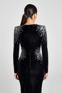 The ELLIE Black Dress is crafted from our signature velvet fabrication and cut to a bodycon midi silhouette. Structured shoulder pads frame the look, while starburst embellishment detailing adds a touch of opulence to this seasonal staple. Fully lined and finished with a concealed zip closure at the back for a smooth fit. - Signature velvet fabrication - Bodycon midi silhouette - Structured shoulder pads - Long sleeves - Crew neckline - Starburst embellishment detailing at shoulders and sides - Fully lined - Concealed zip closure at back Size & Fit Information - Item runs to our size chart. Please refer here for the best fit. - Stretch Factor: No Stretch - Model is 175cm / 5'9" wearing 4' heels and a size XS