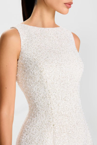 Description & Features A new classic for MERABI, the HOPE White Dress is crafted from white boucle-tweed fabrication, embellished with sequin and pearl-inspired detailing, and lined in satin for a smooth finish. The dress features an elevated boat neckline, a sleeveless relaxed A-line mini silhouette, and subtle front seam detailing for a contoured effect. A concealed zip at the back ensures a seamless fit. - White boucle-tweed with sequin and pearl-inspired embellishments - Elevated boat neckline - Sleeveless A-line mini silhouette - Subtle front seam detailing for contouring - Concealed zip closure at the back - Lined in satin Size & Fit Information - Item runs to our size chart. Please refer here for the best fit. - Stretch Factor: No Stretch - Model is 175cm / 5'9" wearing 4' heels and a size XS