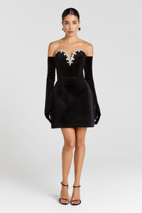 The INES Black Dress is crafted from our exclusively designed velvet fabrication and features a bandeau sweetheart neckline with structured V detailing at the front. An opulent jewel droplet trim frames the decolletage, while a corset bustier with boning to the front, back and sides adds structure for a cinched silhouette. Featuring a tulip mini skirt with pockets at the side for convenience on the move. Finished with a concealed zip closure at the back for a smooth fit. Style with our JESSICA Black Gloves to complete the look. - Exclusively designed velvet fabrication - Bandeau sweetheart neckline with structured V detailing - Opulent jewel droplet trim to frame the decolletage - Corset bodice with boning to the front, back and sides - Signature tulip skirt with pocket to the side - Concealed zip closure at back - Lined in satin Size & Fit Information - Figure-hugging fit - Model is 175cm/5'9" wearing 4" heels and a size XS - Item runs to our size chart . Please refer to it for the best fit.
